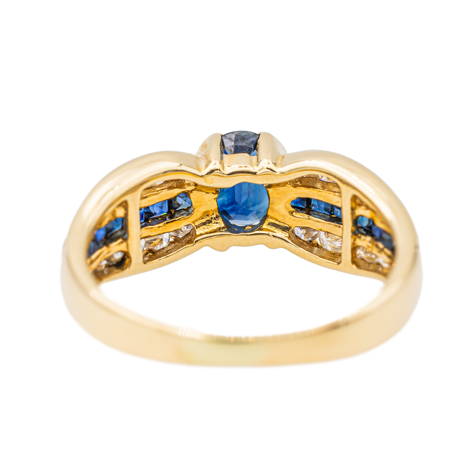Bague en or jaune 750 millièmes (18 carats), sertie de saphirs et de diamants, un saphir taille ovale, d'un poids total d'environ 0,55 ct, 14 saphirs taille carrée, d'un poids total d'environ 0,42 ct, (chaque saphir d'un poids d'environ 0,03 ct), entourés de 24 diamants taille brillant, environ H-VS, d'un poids total d'environ 0,48 ct, (16 diamants d'un poids d'environ 0,02 ct et 8 diamants d'un poids d'environ 0,01), largeur sur le dessus : 0,65 cm, tour de doigt : 51, poids total : 3,69 g, poinçon hibou, excellent état