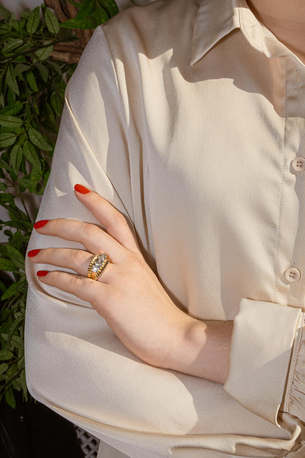 Bague en or rose et blanc 750 millièmes (18 carats), pavée de 4 diamants, 1 diamant taille ancienne, environ I-SI, d'un poids total d'environ 0,32 ct, 1 diamant taille ancienne, environ I-SI, d'un poids total d'environ 0,67 ct, 1 diamant taille ancienne, environ I-SI, d'un poids total d'environ 0,76 ct, 1 diamant taille ancienne, environ I-SI, d'un poids total d'environ 0,28 ct, poids total diamants : 2,03 cts, largeur sur le dessus : 1,37 cm, tour de doigt : 55, poids total : 10,97 g, poinçon hibou, excellent état