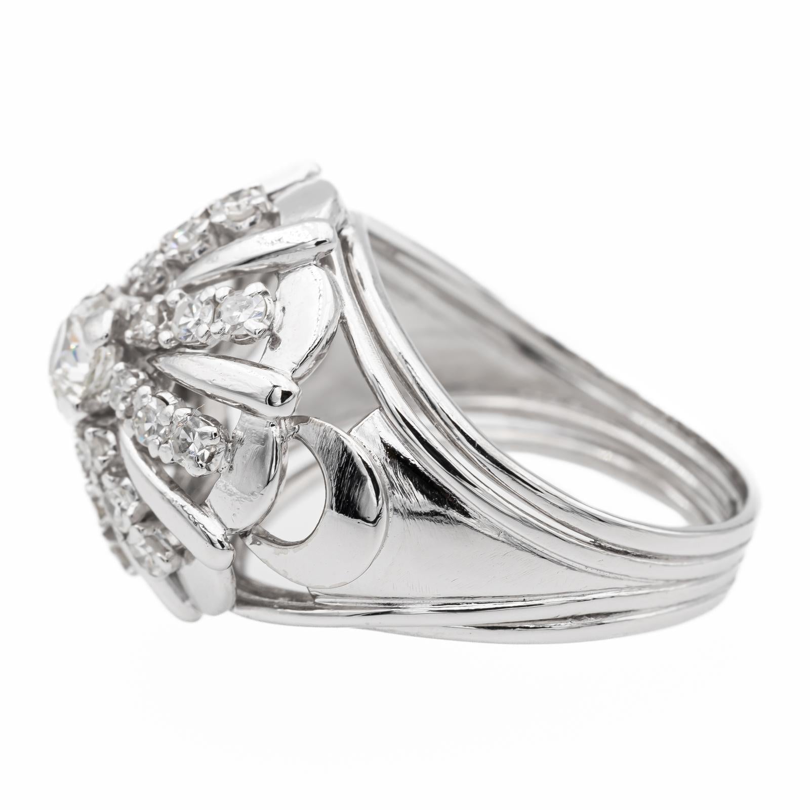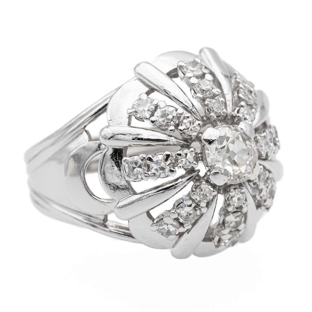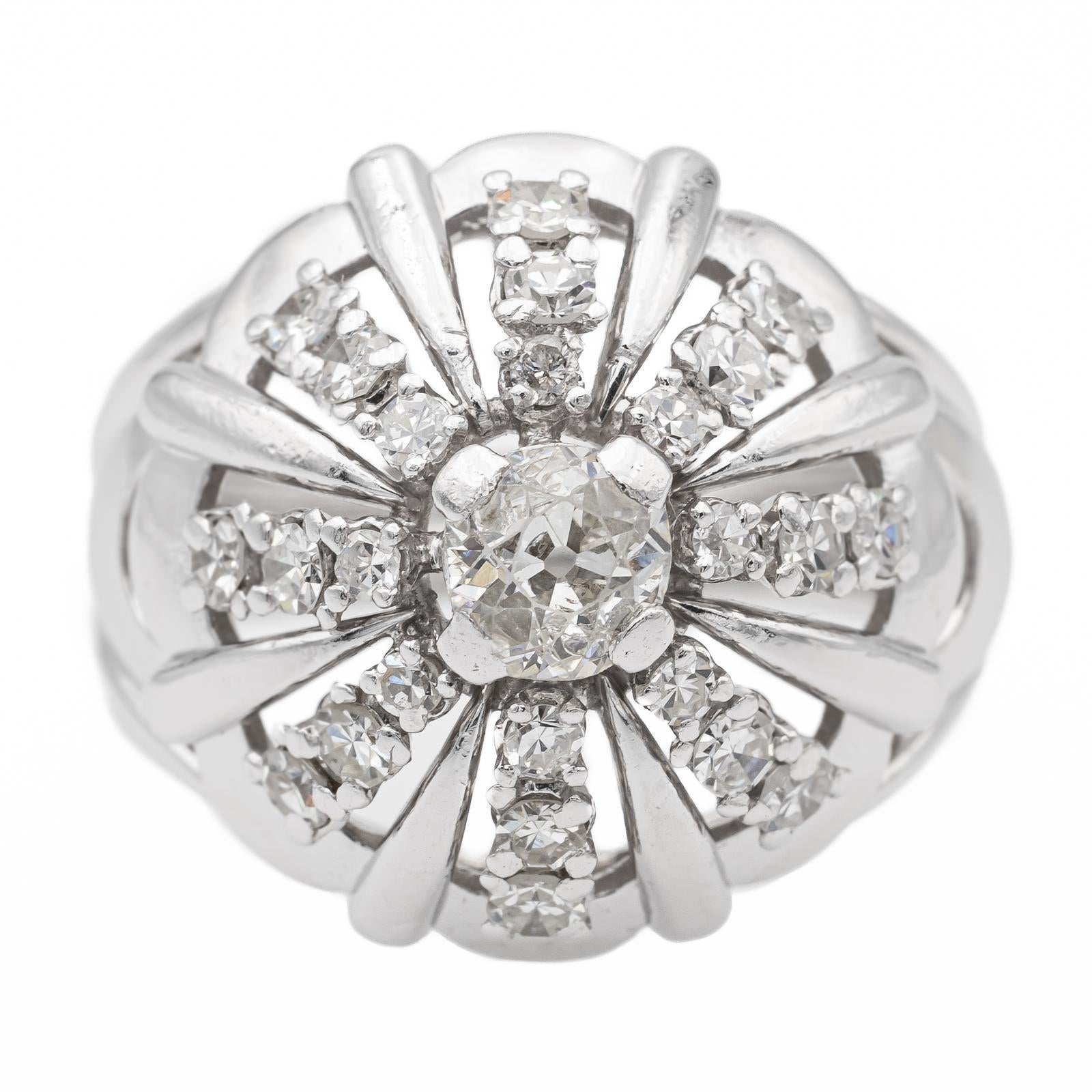 Bague rétro en platine 950 millièmes, ajourée et pavée de diamants, 1 diamant central taille ancienne, environ I-VS, d'un poids total d'environ 0,35 ct, entouré de 24 diamants taille ancienne, environ G-SI, d'un poids total d'environ 0,56 ct et (16 diamants d'environ 0,03 ct chacun et 8 diamants d'envrion 0,01 ct chacun), poids total diamants: environ 0,91 ct, largeur sur le dessus: 1,9 cm, tour de doigt: 57, poids total: 12,69 g, poinçon mascaron, excellent état