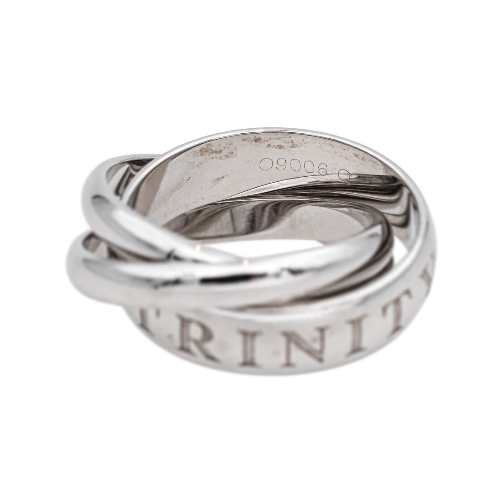 Bague signée de la Maison Cartieer en or blanc 750 millièmes (18 carats), modèle Trinity édition "Or, Amour et Trinity" de 1998, largeur sur le dessus : 1 cm, tour de doigt : 48, poids total : 10,74 g, poinçon tête d'aigle, excellent état