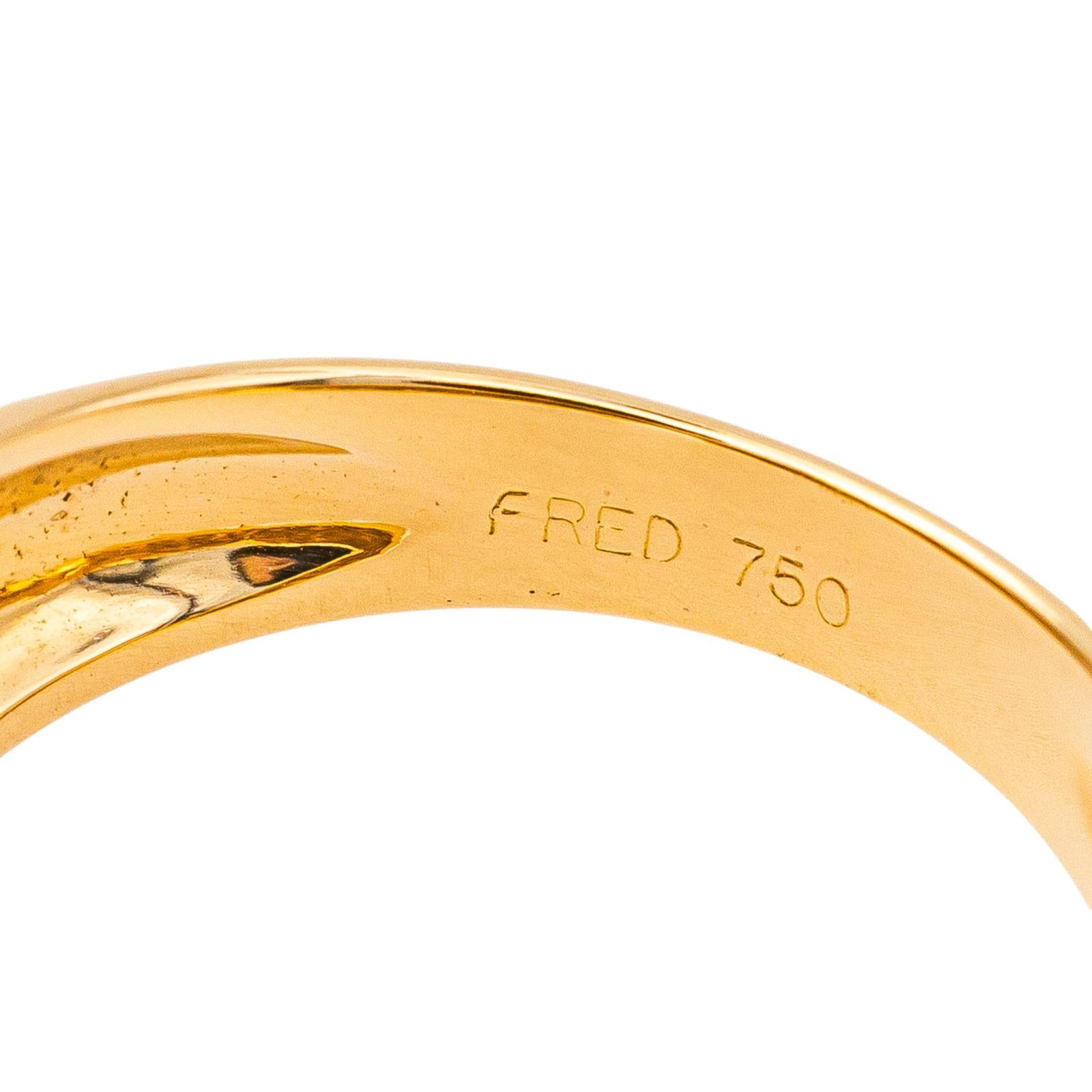 Bague signée de la Maison Fred en or jaune 750 millièmes (18 carats), sertie d'une perle de culture, dimensions de la perle : 0,68 x 0,68 cm, largeur sur le dessus : 1,00 cm, tour de doigt : 52, poids total : 8,99 g, poinçon tête d'aigle, vendue avec pochette d’origine et d’époque, excellent état