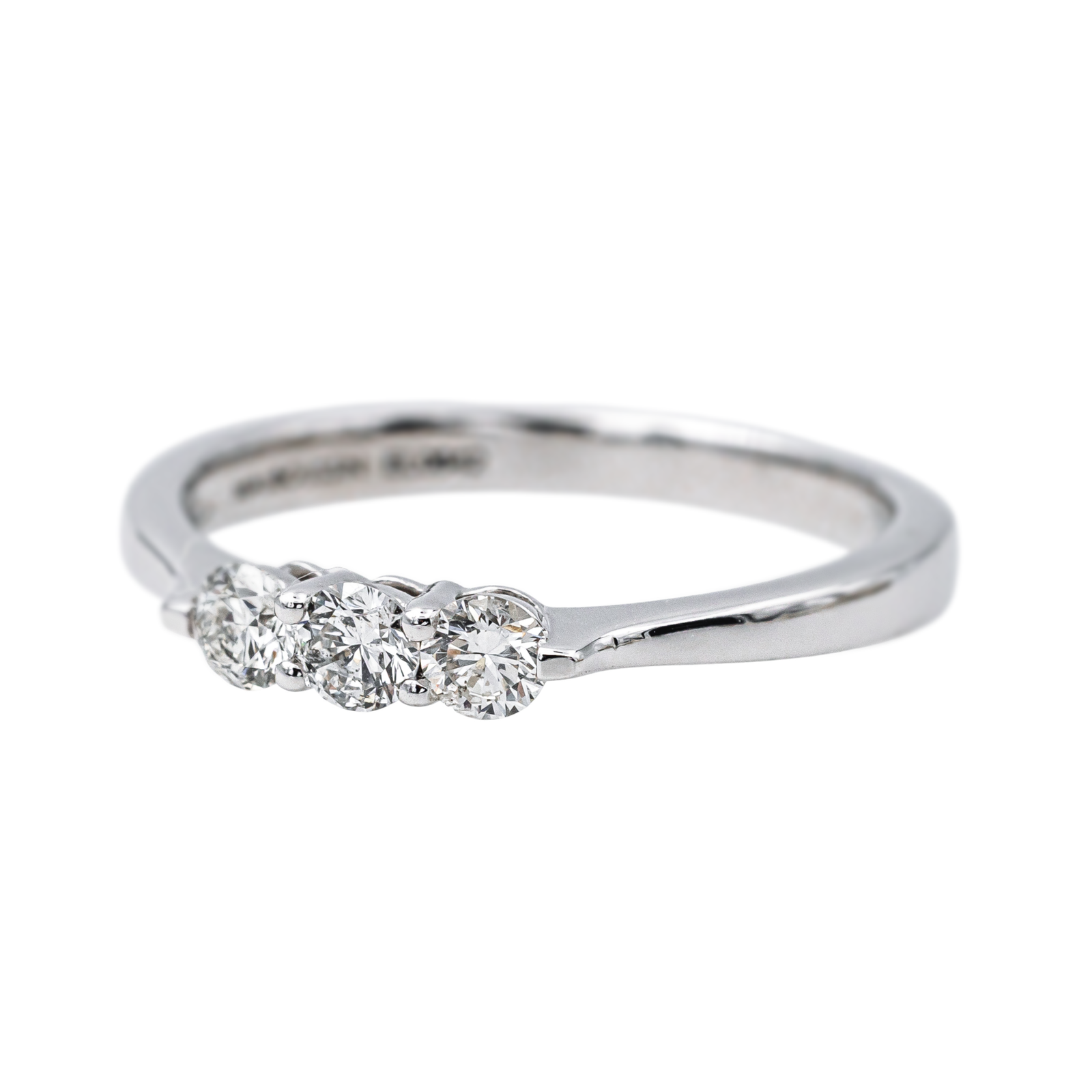 Alliance signée de la Maison Mauboussin en or blanc 750 millièmes (18 carats), modèle l'Alliance du Nouveau Monde, sertie de 3 diamants taille brillant environ H-SI, d'environ 0,10 ct chacun, poids total diamants : environ 0,30 ct, largeur sur le dessus : 0,31 cm, tour de doigt : 54, poids total : 2,82 g, poinçon tête d'aigle, numérotée : EL0642, excellent état