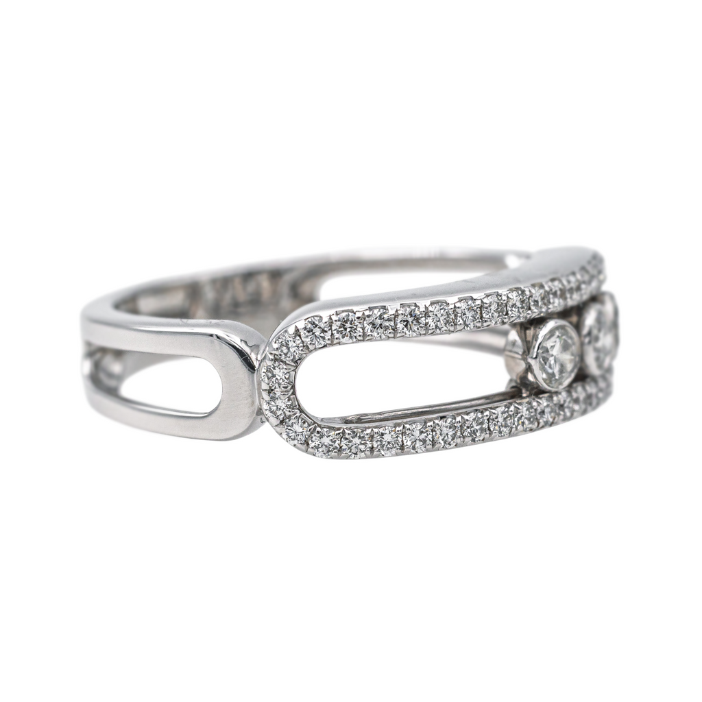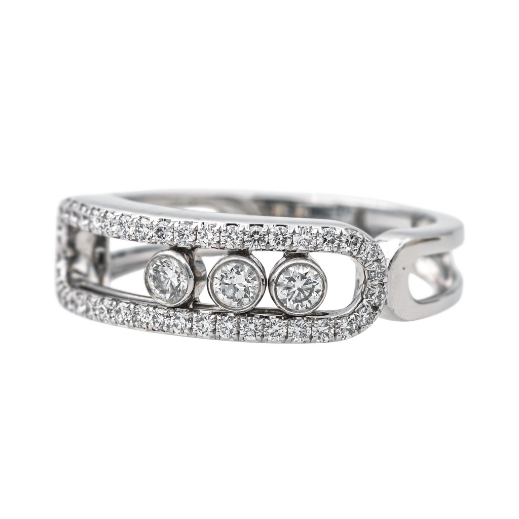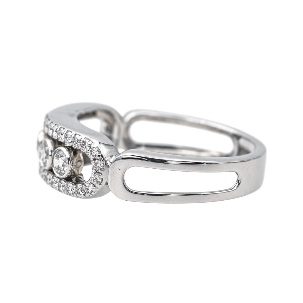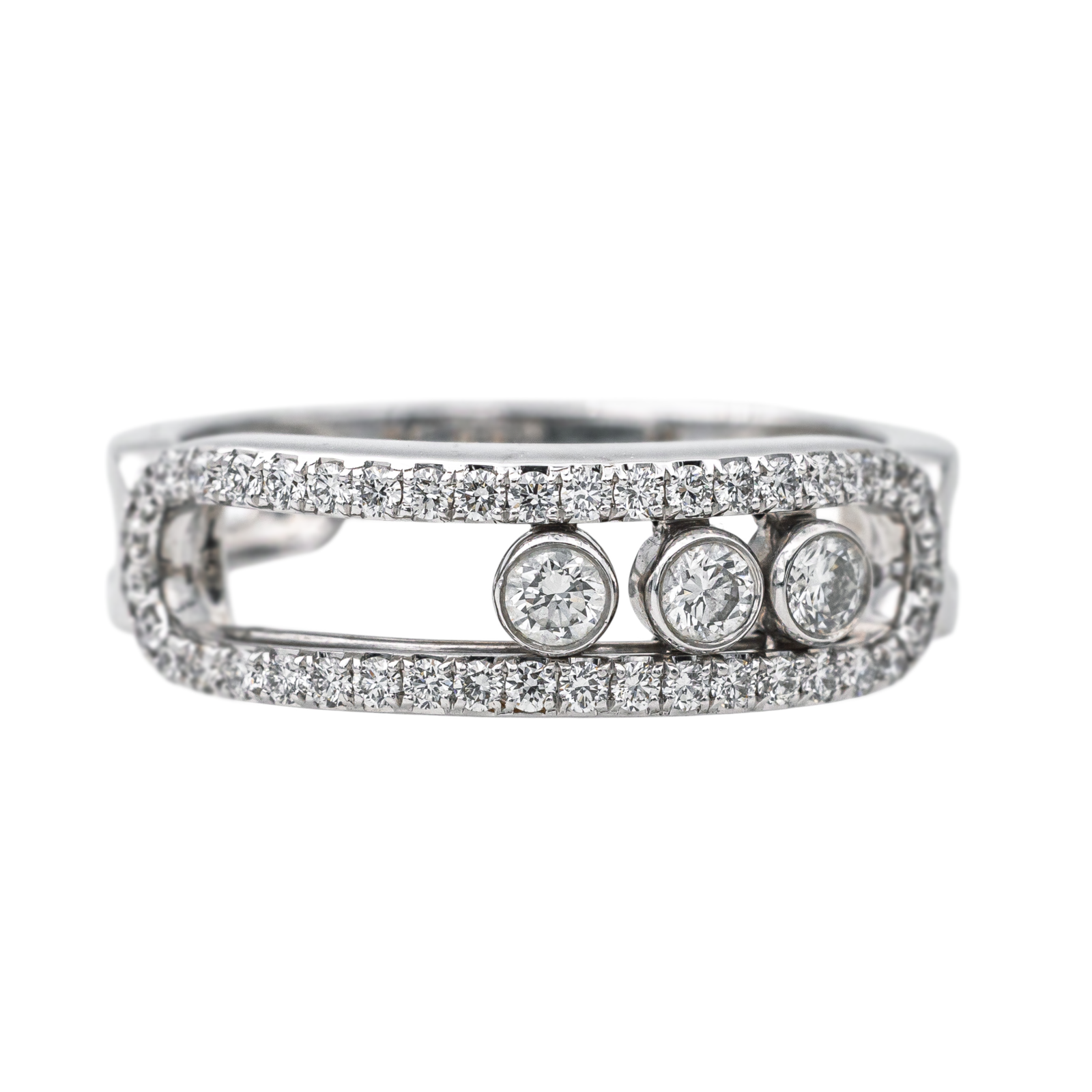 Bague signée de la Maison Messika en or blanc 750 millièmes (18 carats), modèle Move, pavée de diamants, 48 diamants taille brillant, environ H-VS , d'un poids total d'environ 0,50 ct : diamant d'un poids d'environ 0,10 ct environ et 45 diamants d'un poids d'environ 0,005 ct chacun, largeur sur le dessus : 0,65 cm, tour de doigt : 57, poids total : 4,22 g, poinçon tête d'aigle, vendu avec écrin d'origine, numérotée : H31249, excellent état