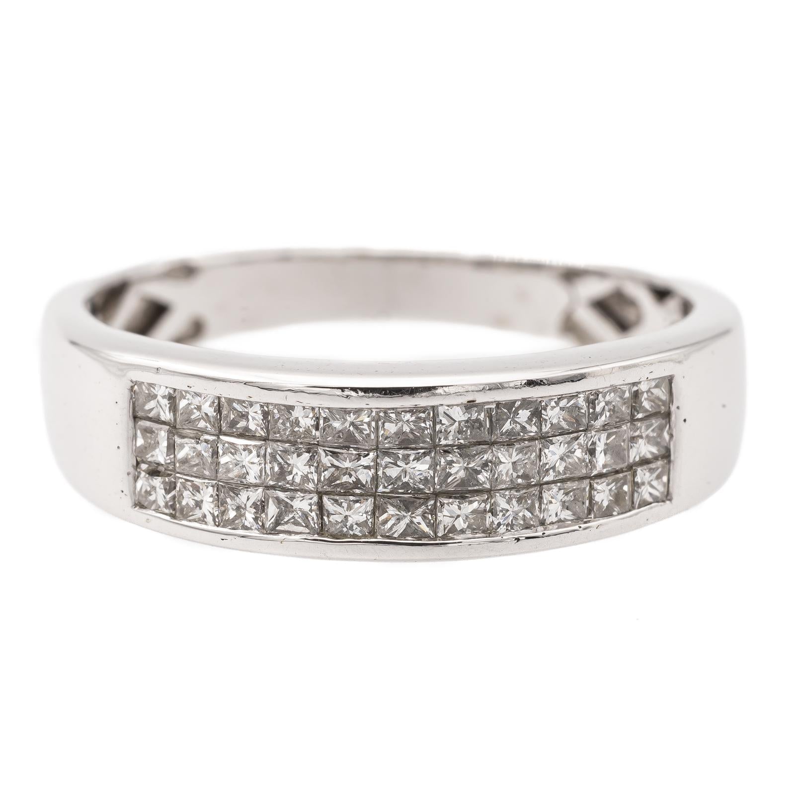 Bague bandeau en or blanc 750 millièmes (18 carats), sertie de 39 diamants taille princesse, estimés H/SI, environ 0,01 ct chacun, Poids total estimé des diamants: 0,39 ct, Tour de doigt: 50, Largeur: 0,50 cm, Poids total: 2,88 g, Poinçon tête d'aigle, Excellent état