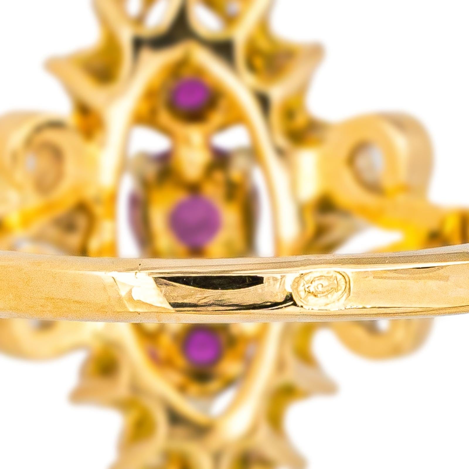 Bague en or jaune 750 millièmes (18 carats), sertie de rubis et de diamants, 1 rubis taille rond, d'un poids total d'environ 0,16 ct, 2 rubis taille rond, d'un poids total de 0,14 ct (chaque rubis d'un poids d'environ 0,07 ct), entourés de 16 diamants taille brillant, environ G-VS, d'un poids total d'environ 0,32 ct, (chaque diamant d'un poids d'environ 0,02 ct), largeur sur le dessus : 1,93 cm, tour de doigt : 53, poids total : 4,66 g, poinçon hibou, excellent état