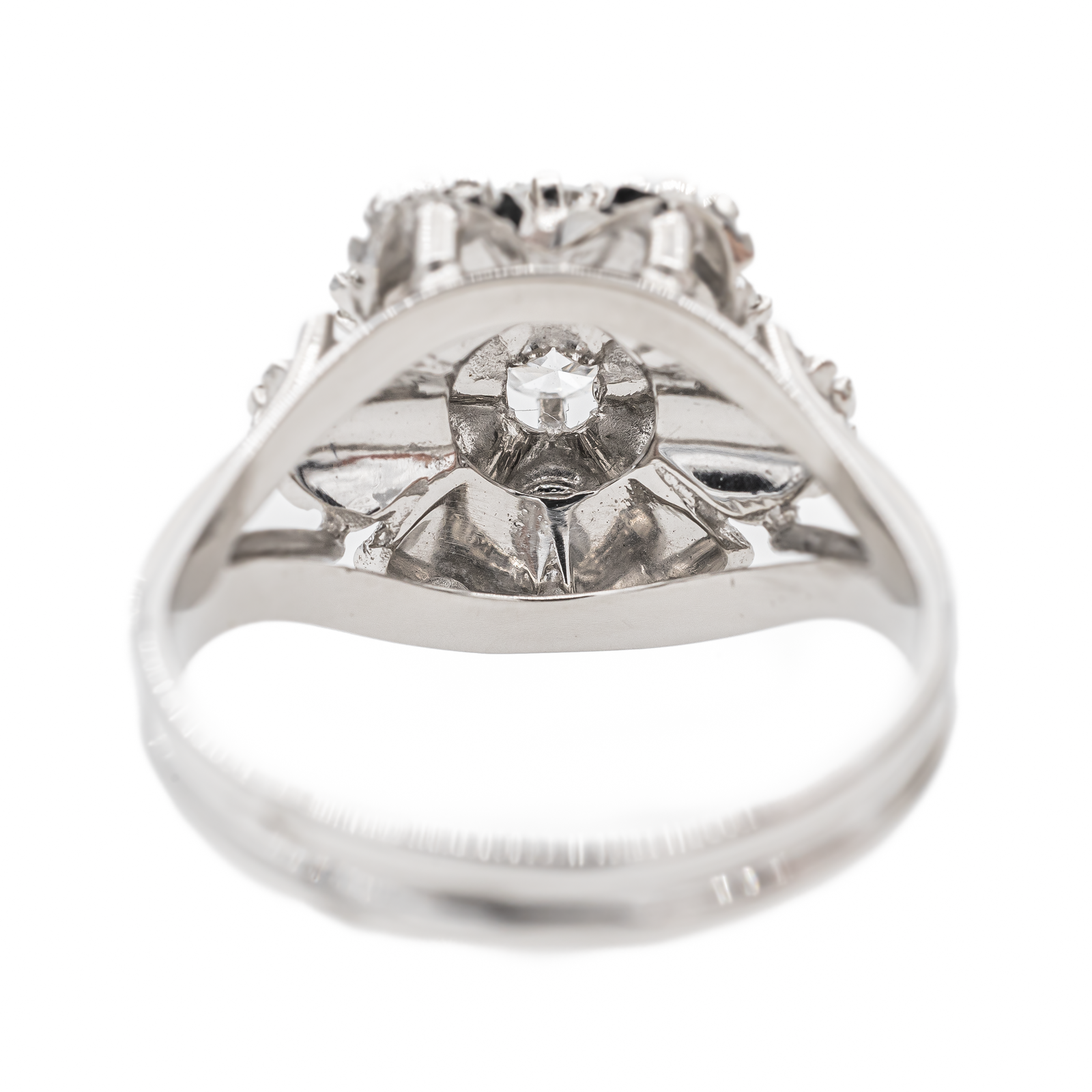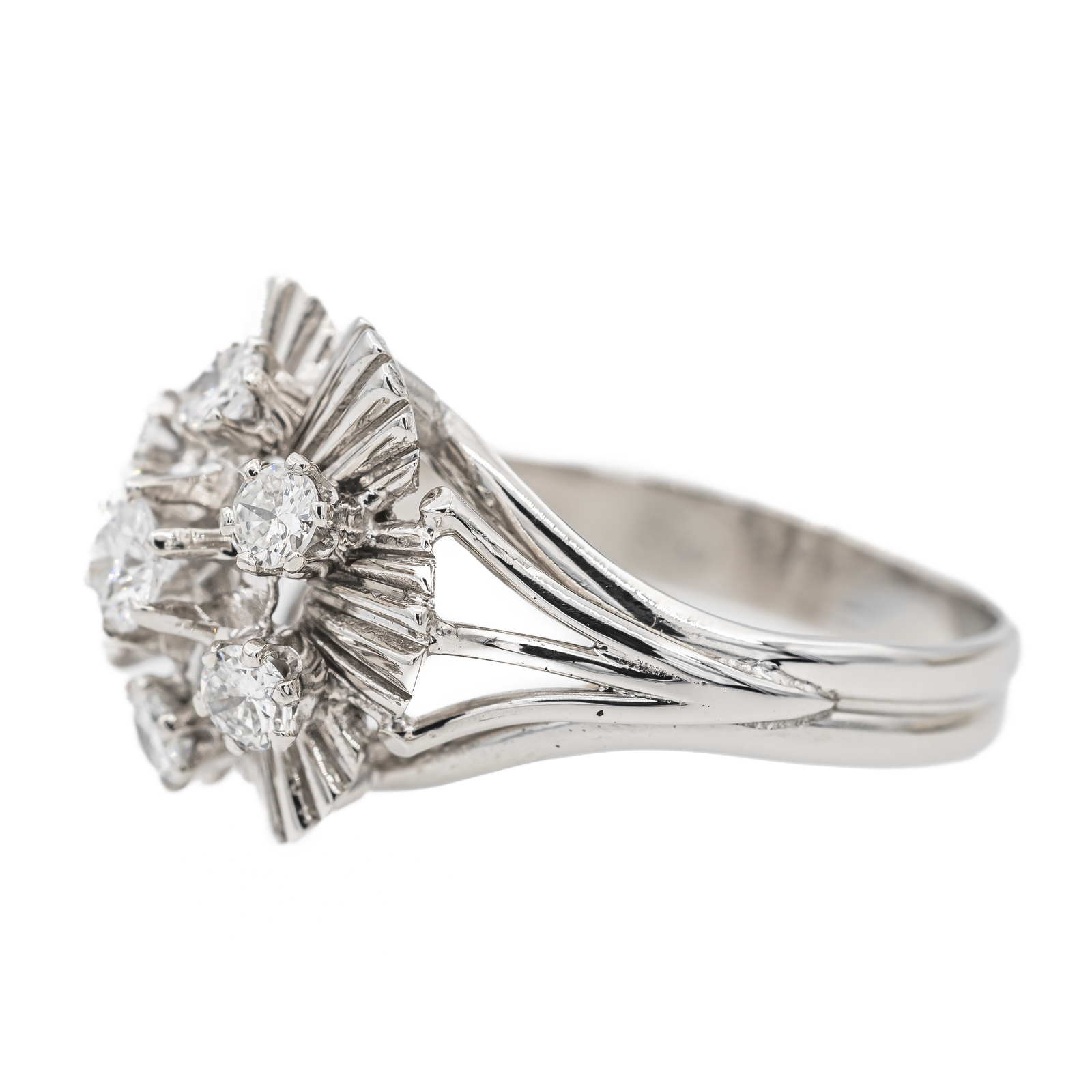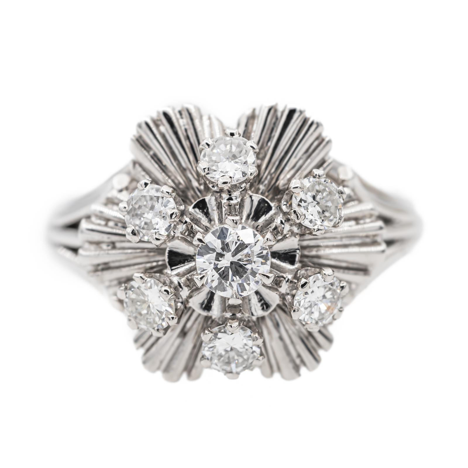Bague en or blanc 750 millièmes (18 carats), sertie de diamants taille brillant, un diamant environ F-VS, d'un poids total d'environ 0,14 ct, 6 diamants environ G-SI, poids total : 1,35 ct, (chaque diamant d'un poids d'environ 0,15 ct), poids total diamants : 1,49 ct, tour de doigt : 51, largeur sur le dessus : 1,30 cm, poids total : 3,66 g, poinçon tête d'aigle, excellent état