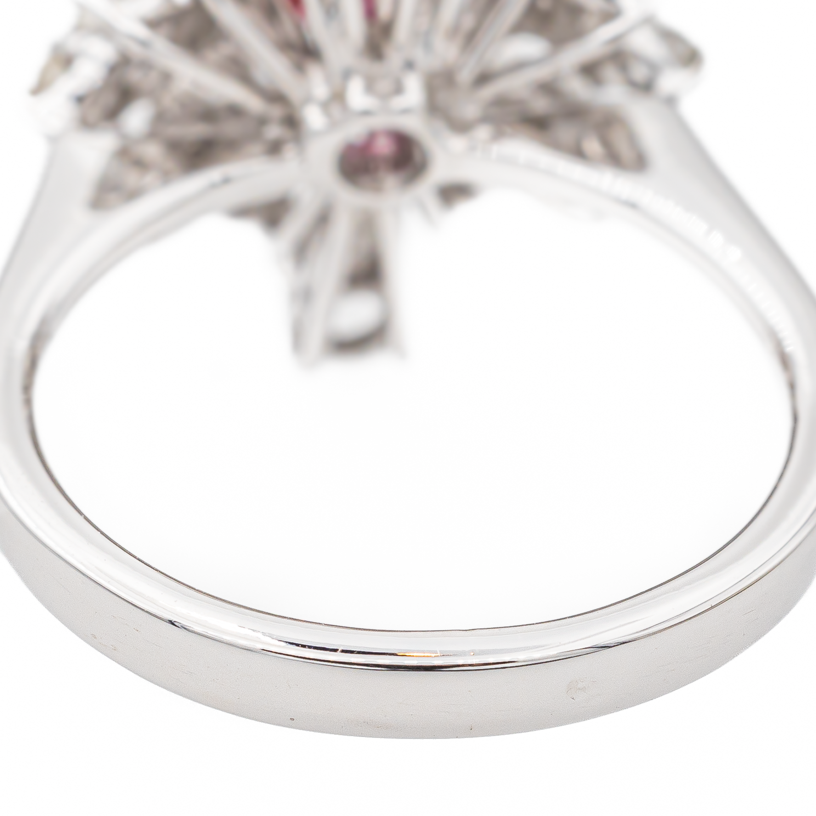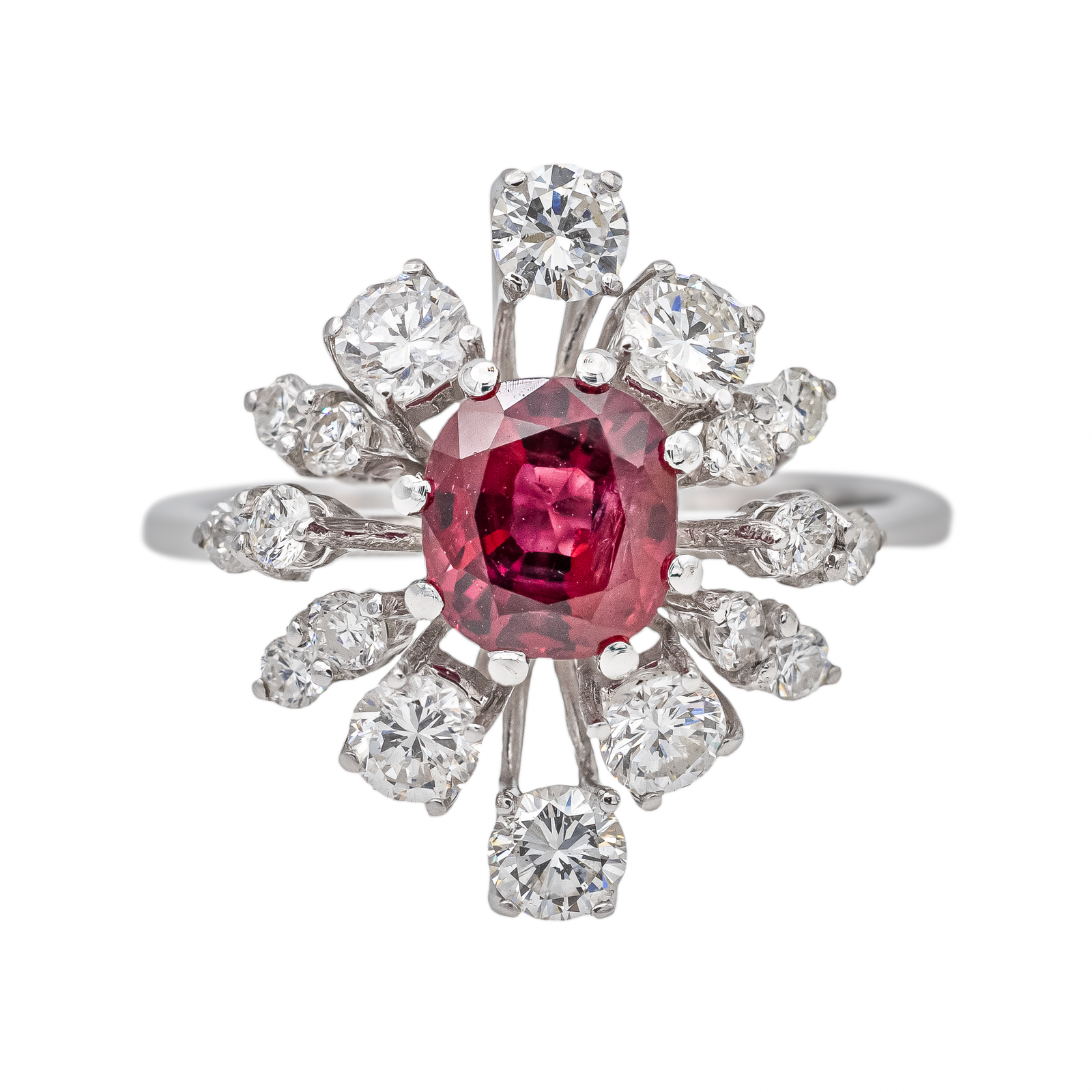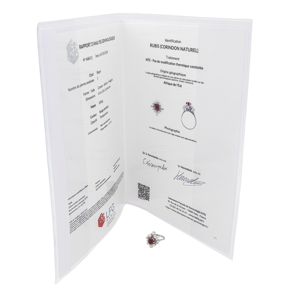 Bague en or blanc 750 millièmes (18 carats), sertie d'un rubis et de diamants, 1 rubis taille coussin - brillant, certifié non chauffé LFG n°408313, d'un poids total d'environ 1,10 cts, entouré de diamants taille brillant, environ G-VS, d'un poids total d'environ 0,60 ct, (chaque diamant d'un poids d'environ 0,10 ct), 12 diamants taille brillant, environ G-VS, d'un poids total d'environ 0,24 ct, (chaque diamant d'un poids d'environ 0,02 ct), poids total diamants environ : 0,84 ct, largeur sur le dessus : 1,73 cm, tour de doigt : 52, poids total : 4,95 g, poinçon hibou, excellent état