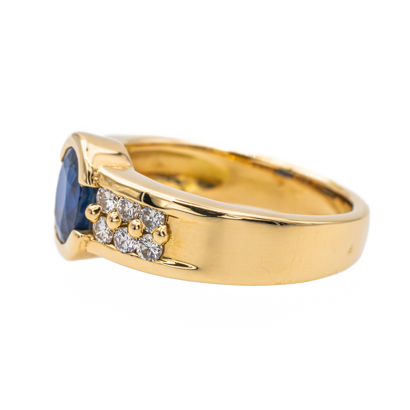 Bague en or jaune 750 millièmes (18 carats), sertie d'un saphir et de diamants, 1 saphir taille ovale, d'un poids total d'environ 1,42 cts, entouré de 12 diamants taille brillant, environ H-SI, d'un poids total d'environ 0,48 ct, (chaque diamant d'un poids d'environ 0,04 ct), largeur sur le dessus : 0,97 cm, tour de doigt : 55,5, poids total : 9,15 g, poinçon tête d'aigle, excellent état