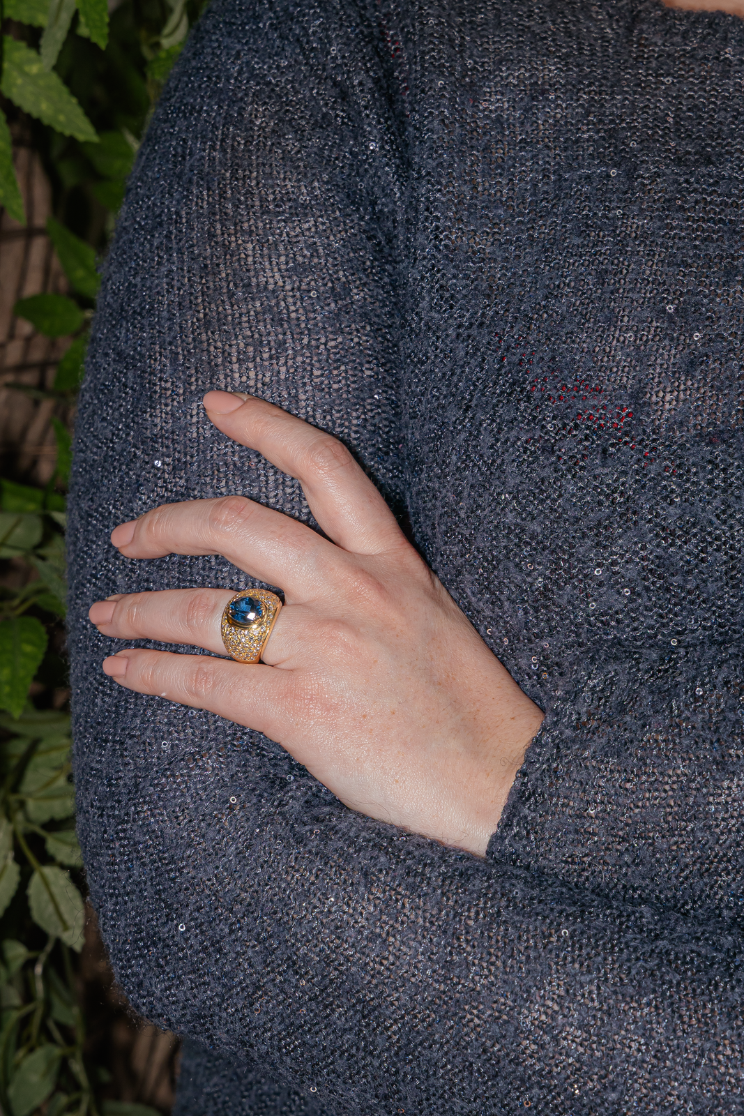 Bague en or jaune 750 millièmes (18 carats), sertie d'un saphir et de diamants, 1 saphir taille ovale, d'un poids total d'environ 3,73 cts, entouré de 74 diamants taille brillant, environ G-SI, d'un poids total d'environ 1,74 cts, (chaque diamant d'un poids d'environ 0,02 ct), largeur sur le dessus : 1,61 cm, tour de doigt : 49,5, poids total : 14,06 g, poinçon tête d'aigle, excellent état
