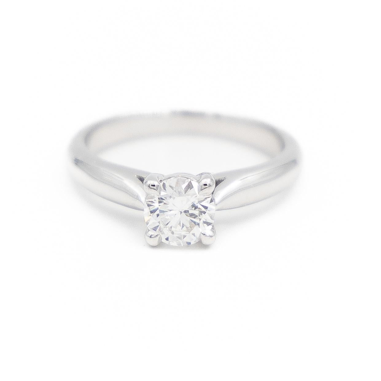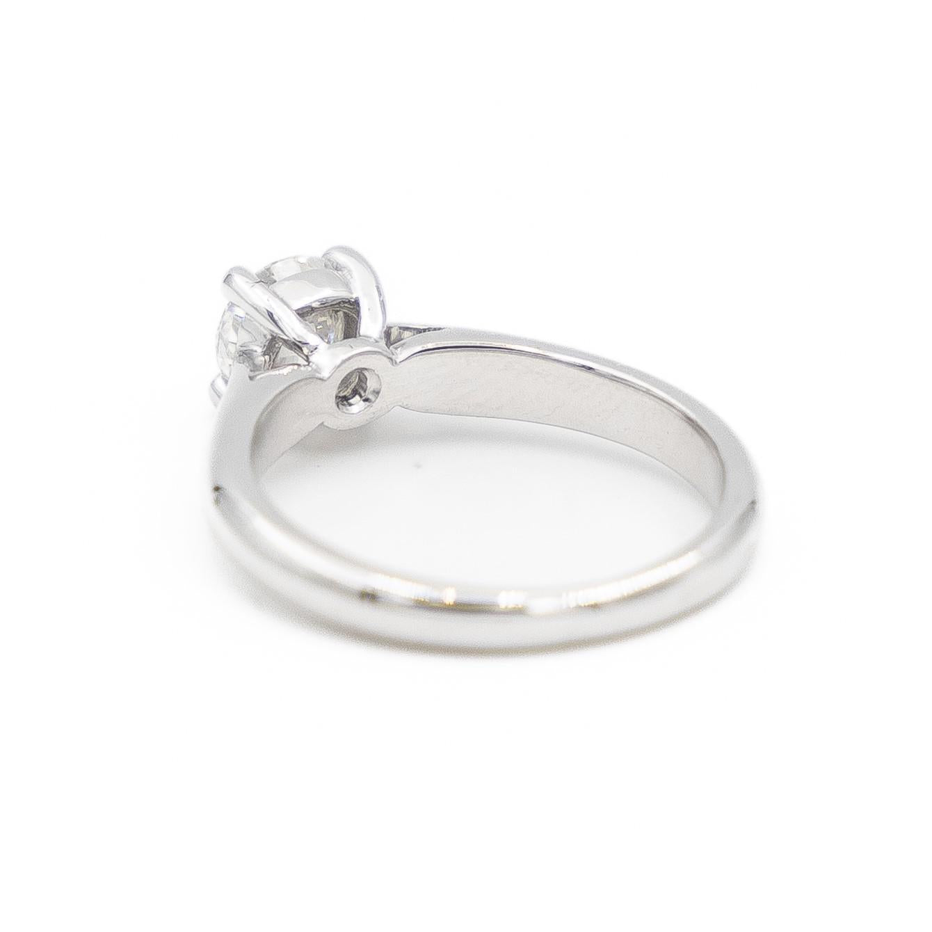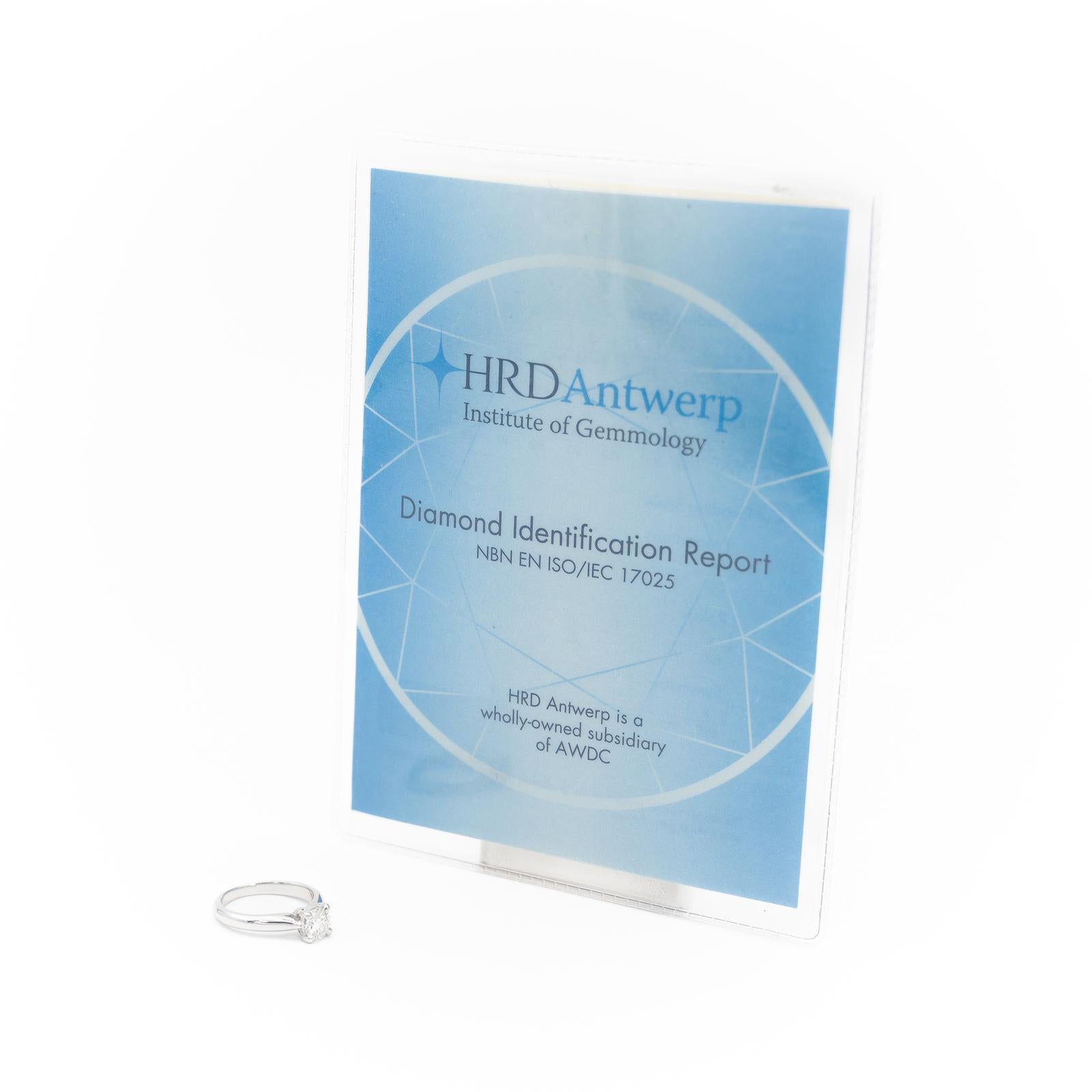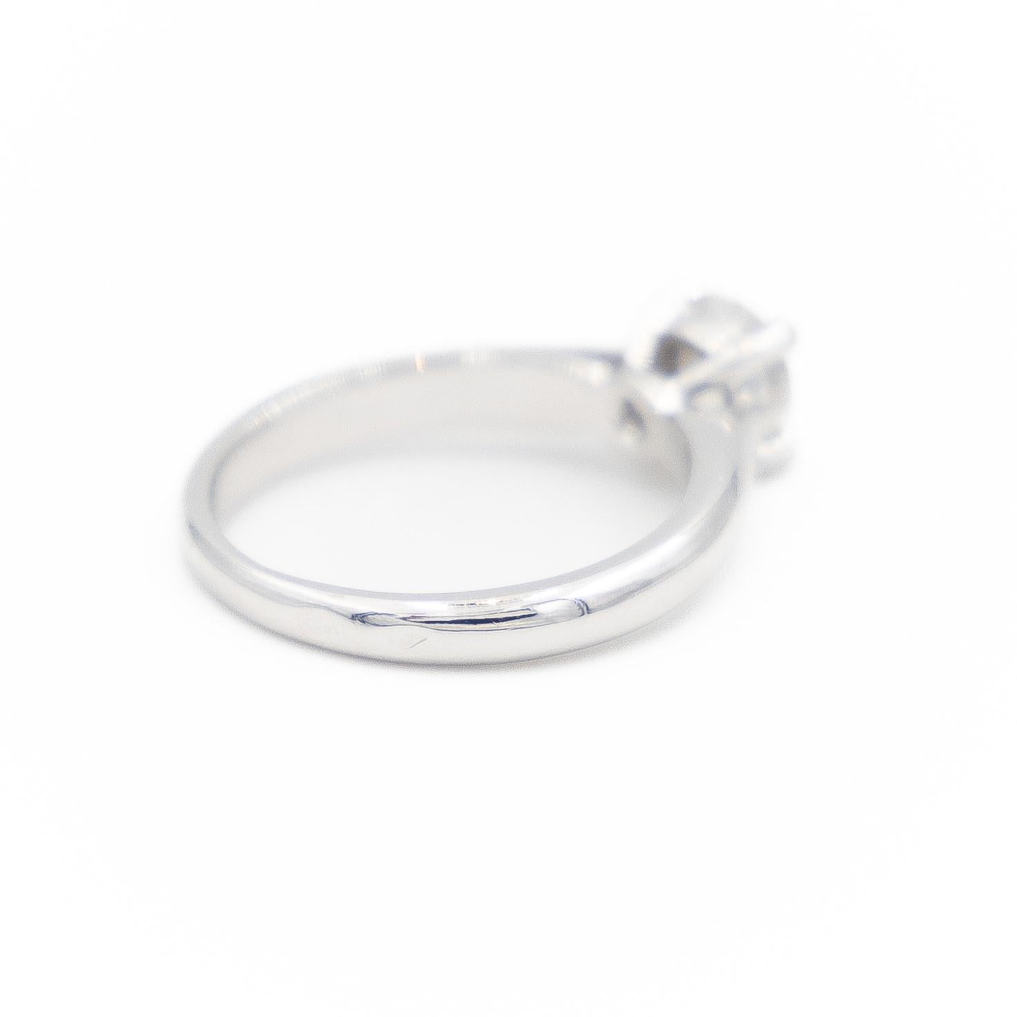 Solitaire en or blanc 750 millièmes (18 carats), sertie d'un diamant de 0,51 ct, taille brillant, F/SI1 certifiée HRD, 3xEX, Tour de doigt: 46, largeur sur le dessus: 0,52 cm, Poids total: 2,93 g, Poinçon tête d'aigle, Excellent état