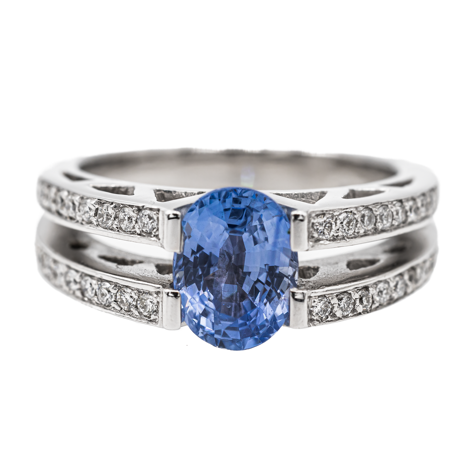 Bague en or blanc 750 millièmes (18 carats), sertie d'un saphir oval environ 1,57 carats, et un pavage de 36 diamants taille brillant, estimés G/SI environ 0,01 ct chacun, Poids total estimé des diamants: 0,36 ct, Tour de doigt: 51, largeur sur le dessus: 0,81 cm, Poids total: 7,59 g, Poinçon tête d'aigle, Excellent état