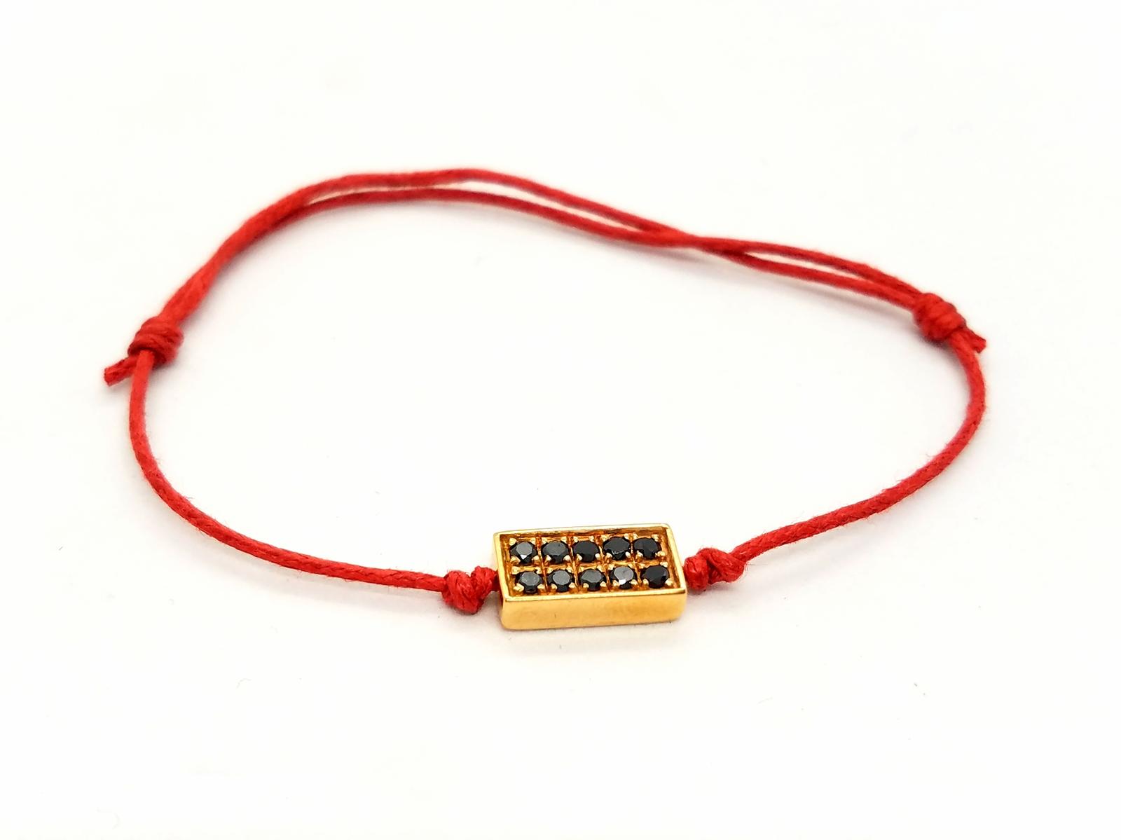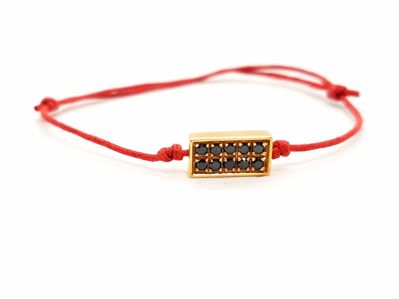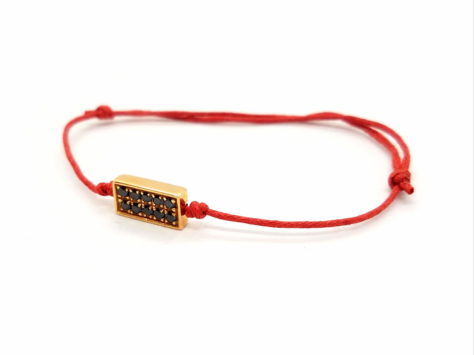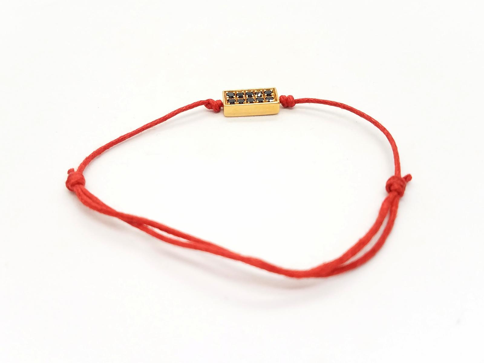 Red cord bracelet, composed of a rectangular motif in 750 thousandths (18 carat) pink gold, set with 10 brilliant-cut black diamonds for a total of 0.20 ct, dimension of the motif: 1.15 cm x 0.6 cm, gold weight: 1.18 g, total weight: 1.33 g, adjustable size, new condition, Internet exclusive