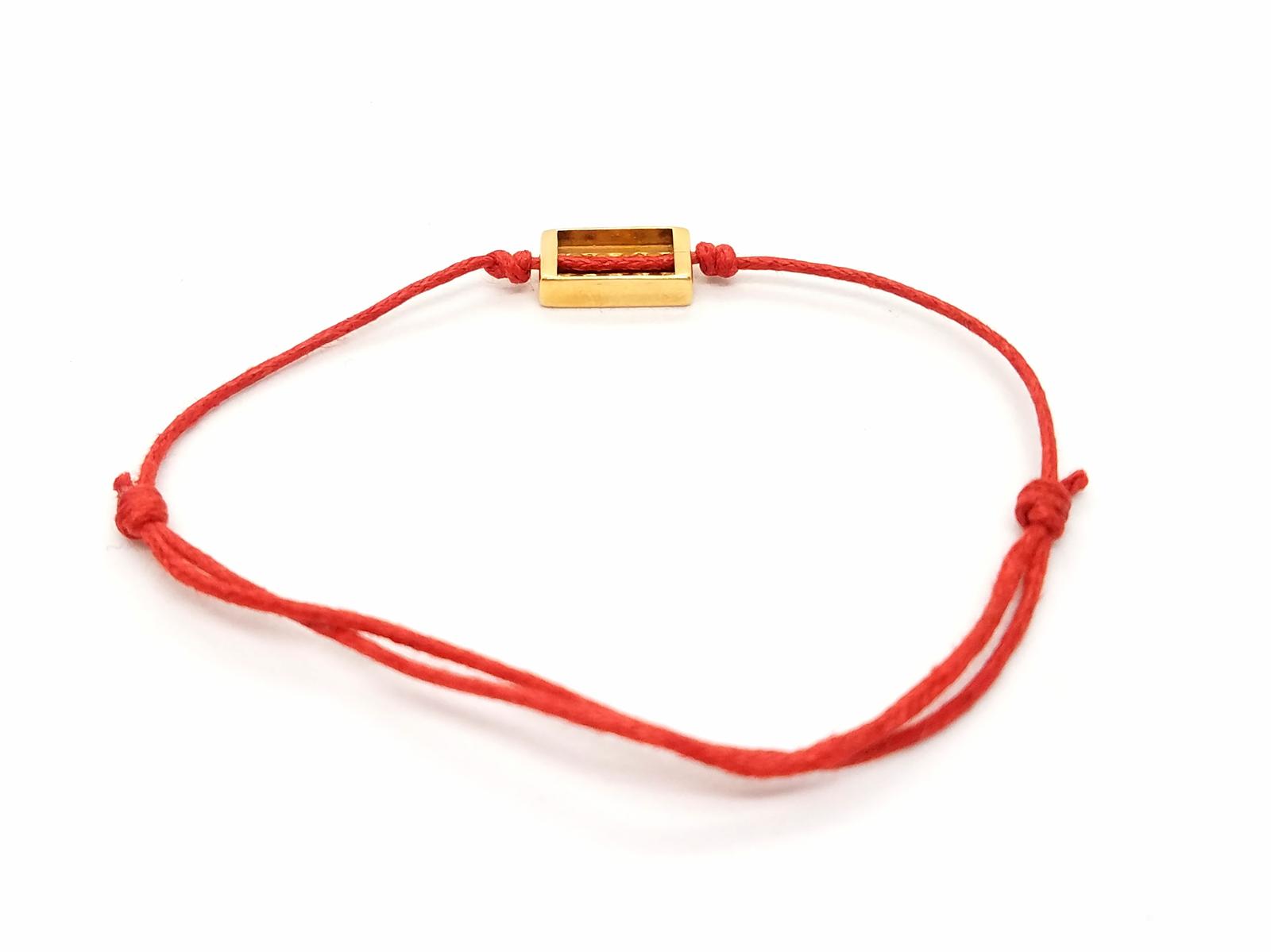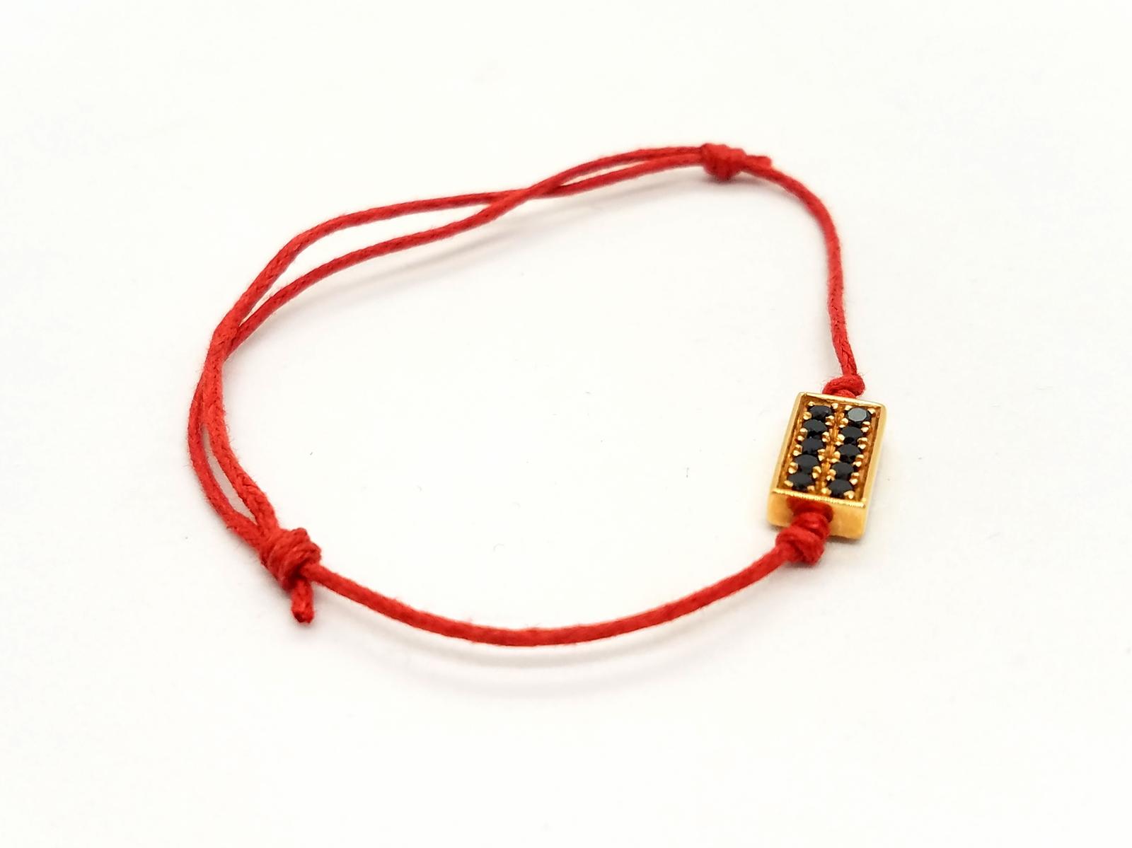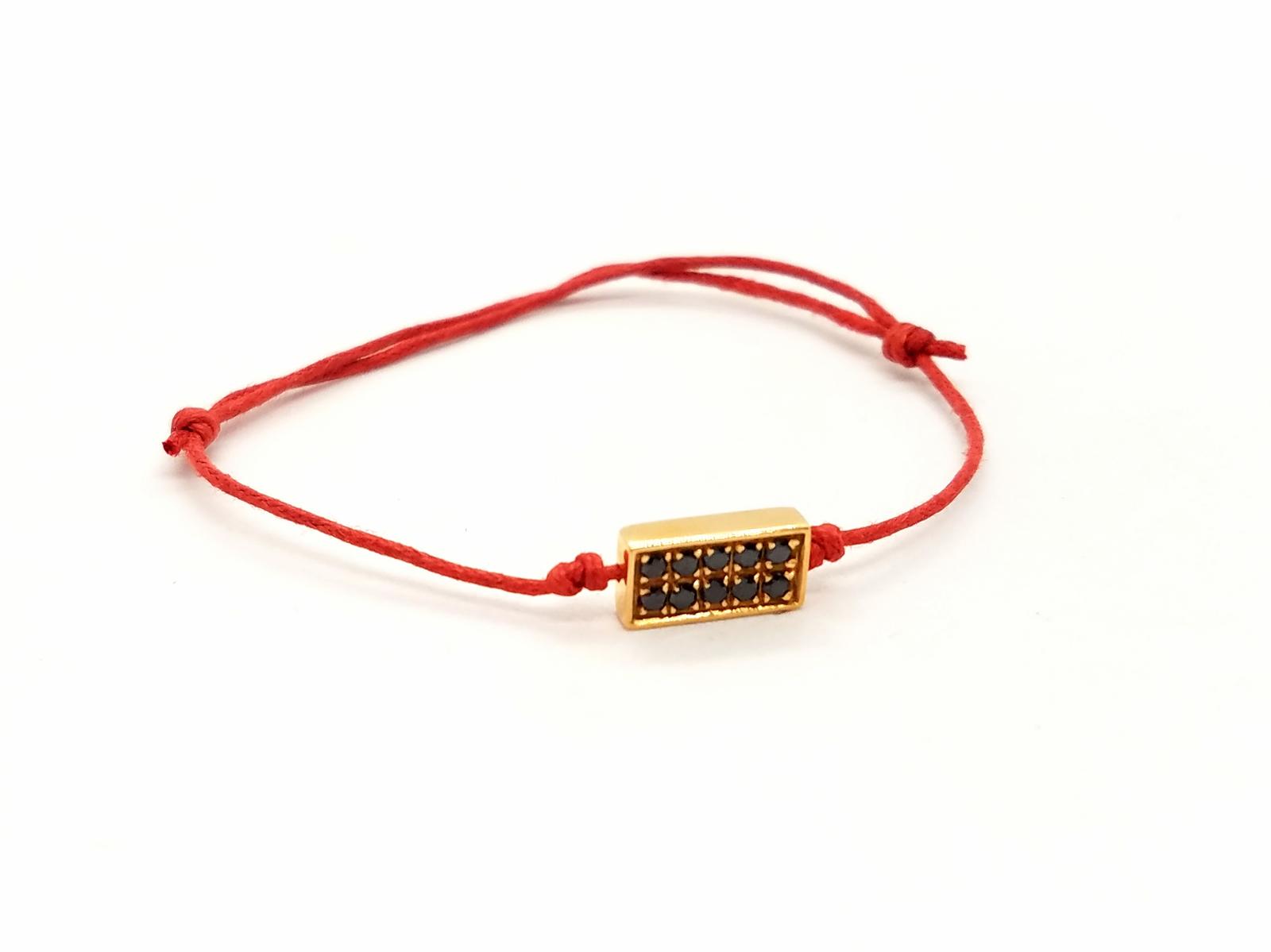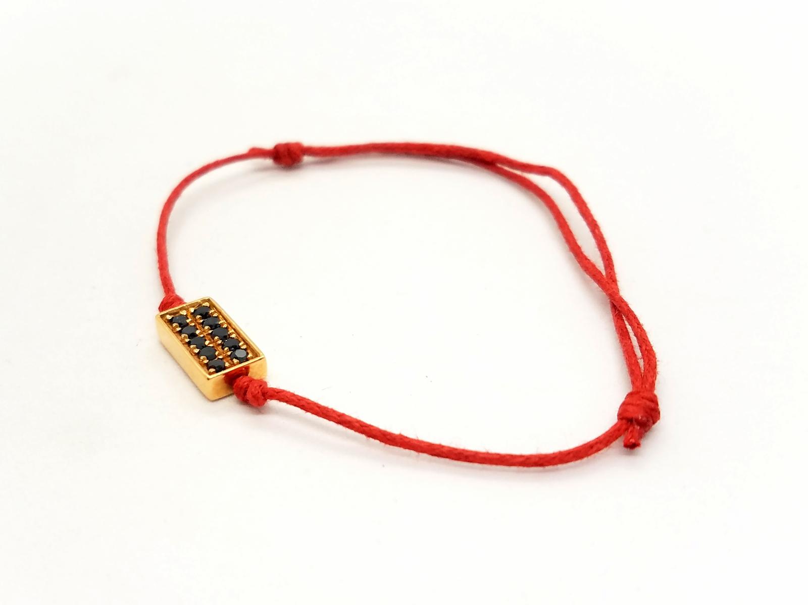 Red cord bracelet, composed of a rectangular motif in 750 thousandths (18 carat) pink gold, set with 10 brilliant-cut black diamonds for a total of 0.20 ct, dimension of the motif: 1.15 cm x 0.6 cm, gold weight: 1.18 g, total weight: 1.33 g, adjustable size, new condition, Internet exclusive