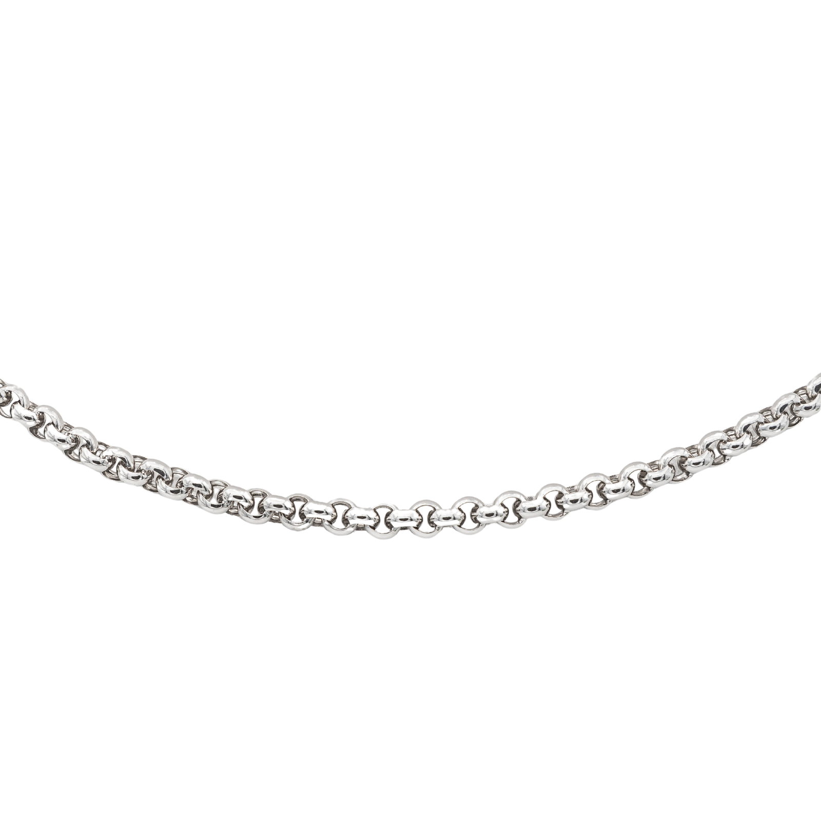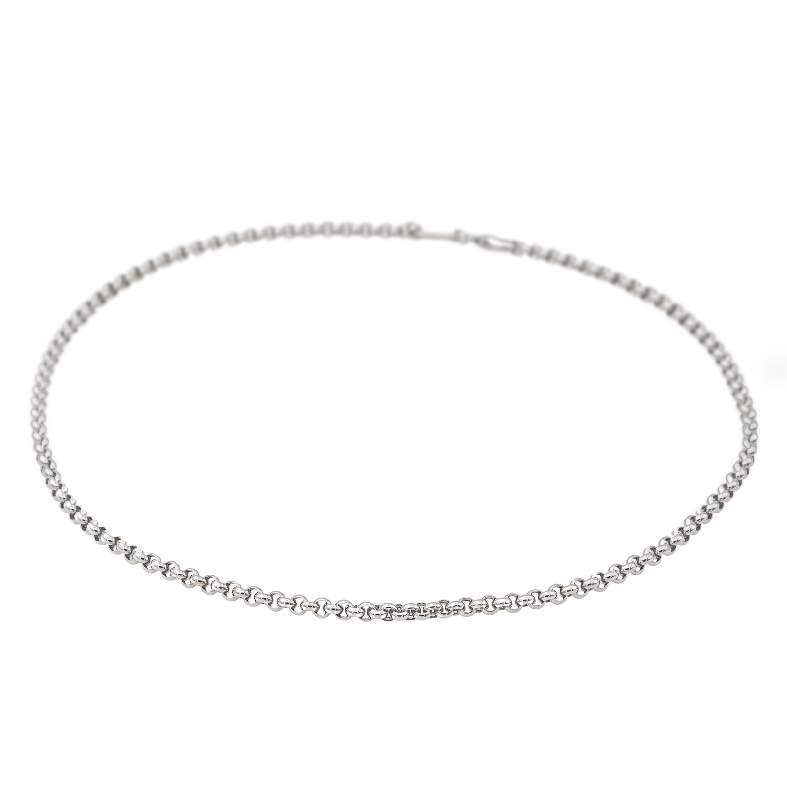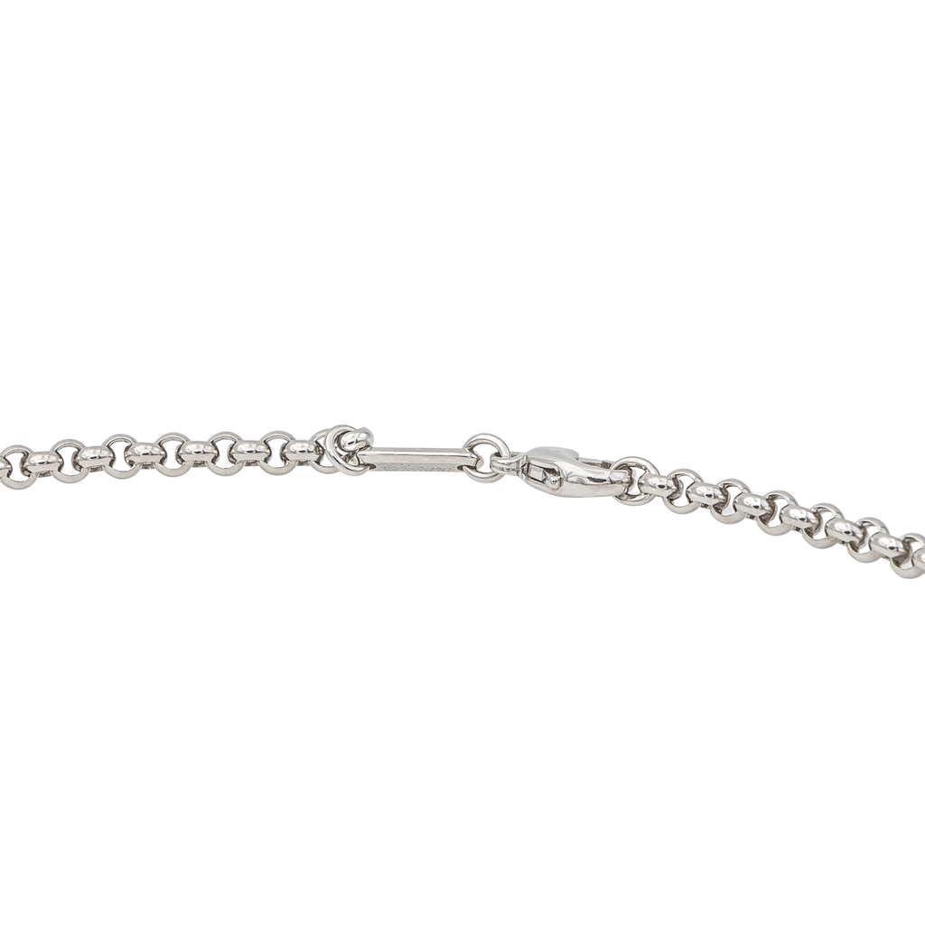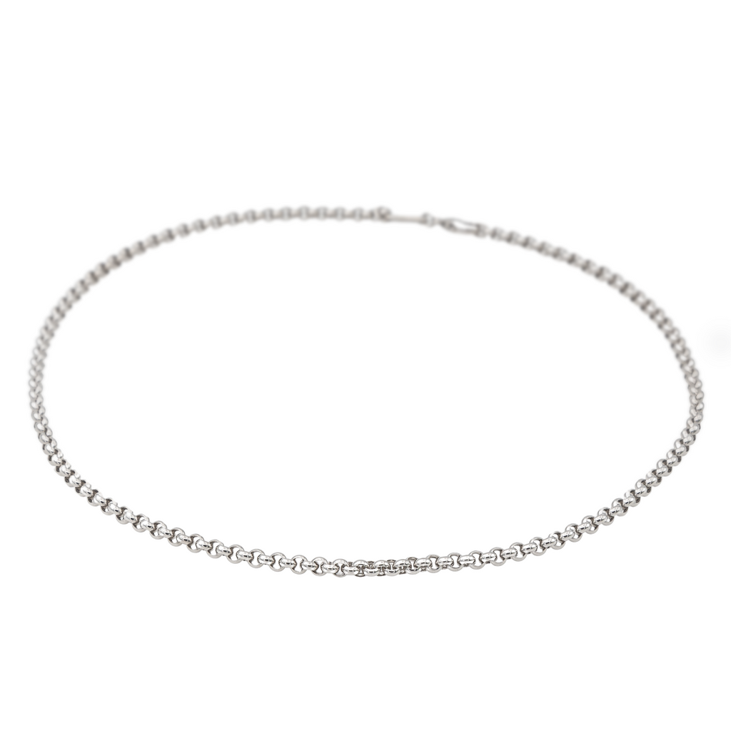 Chaine signée de la Maison Chopard en or blanc 750 millièmes (18 carats), maille jaseron, longueur : 42,00 cm, largeur : 0,34 cm, épaisseur : 0,08 cm, poids total : 17,95 g, poinçon tête d’aigle, excellent état