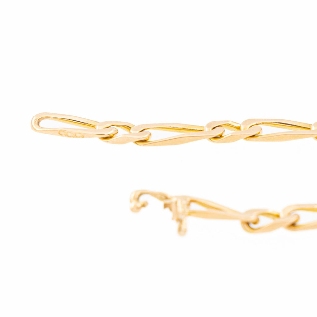 Chaine en or jaune 750 millièmes (18 carats), maille figaro, fermoir avec huit de sécurité, longueur: 79 cm, largeur: 0,4 cm, poids total: 33,73 g, poinçon tête d’aigle, excellent état