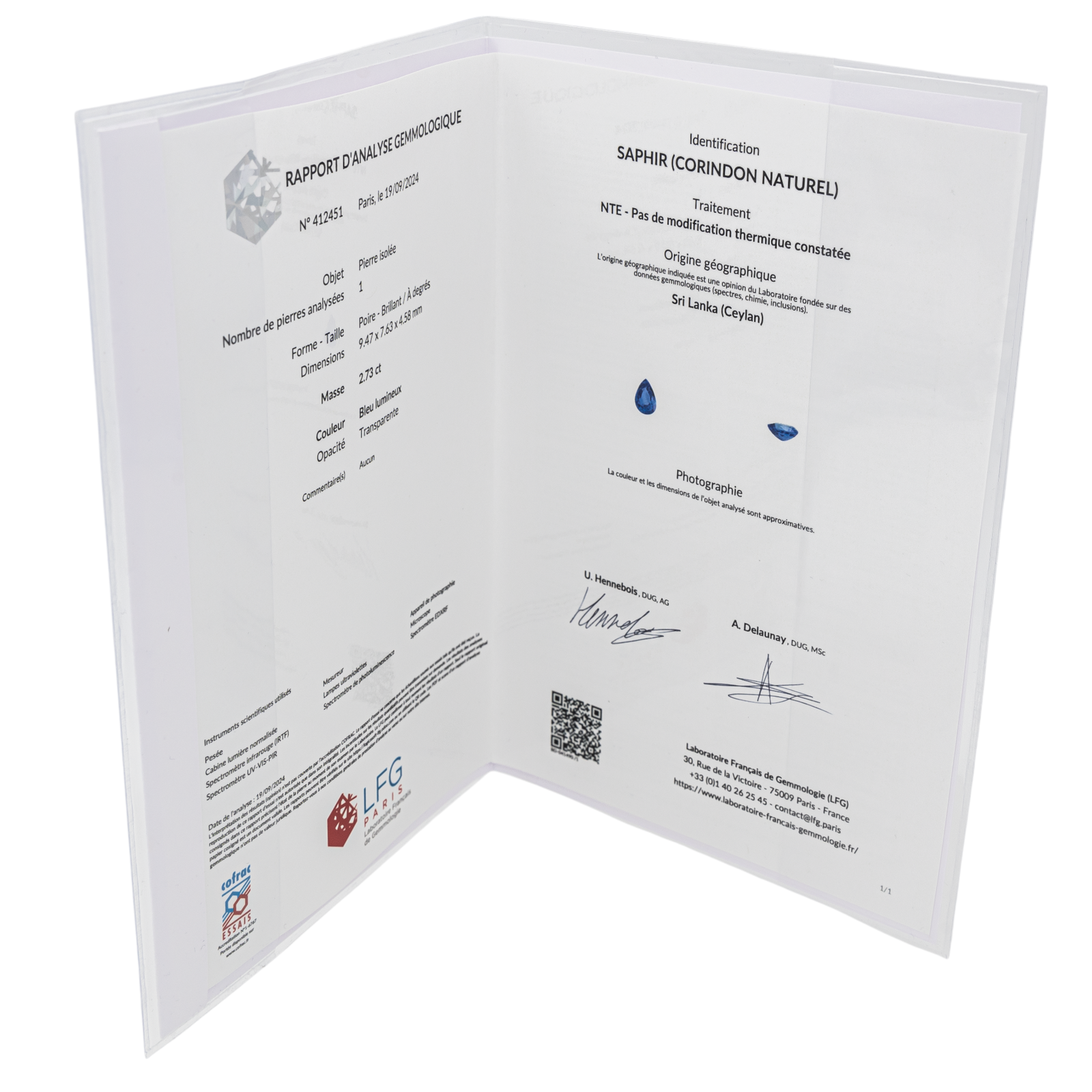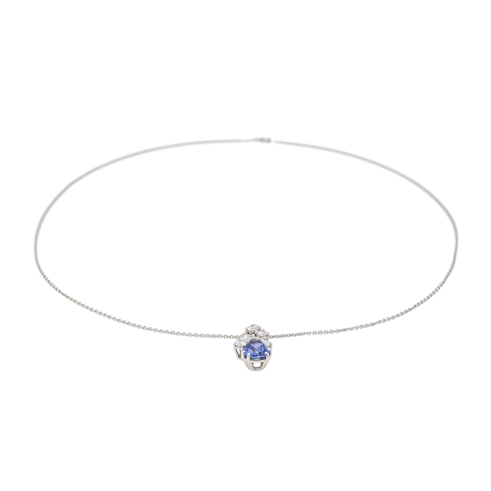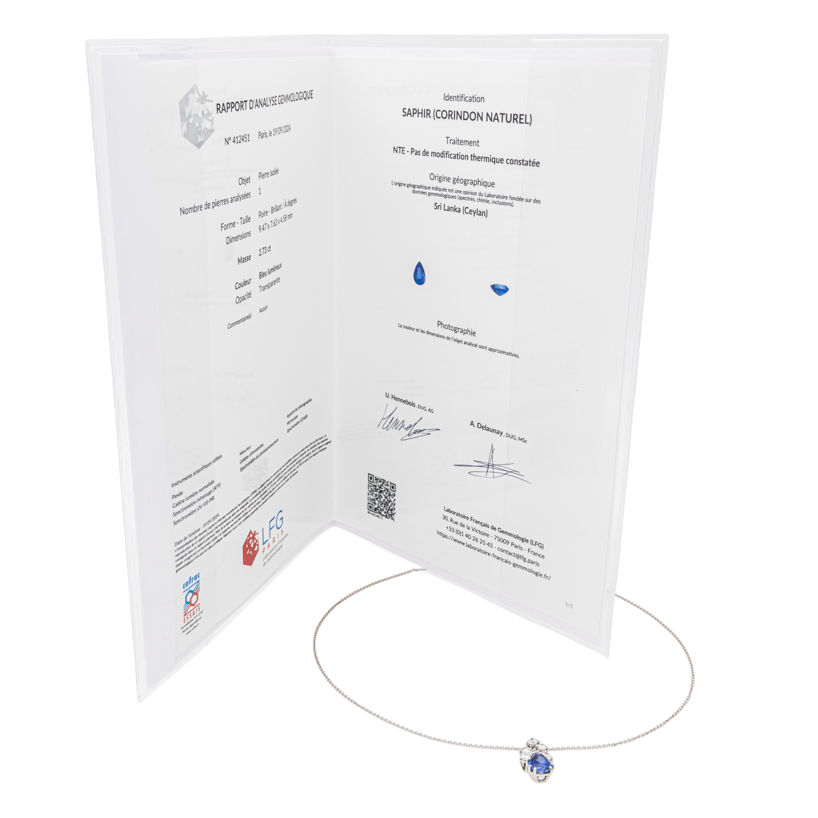 Collier en or blanc 750 millièmes (18 carats), serti d'un saphir taille poire certifié par le LFG "Ceylan non chauffé" de 2.73 cts, 4 diamants taille brillant estimés G/VS d'un poids total de 0.64 ct (environ 0.16 ct chacun) et 2 diamants taille marquise estimés H/VS d'un poids total de 0.20 ct (environ 0.10 ct chacun), Poids total estimé des diamants: 0.84 ct, Dimensions du motif: 1.88 x 1.08 cm, Longueur de la chaine: 43 cm, Poids total: 5.52 g, Poinçon hibou, Excellent état