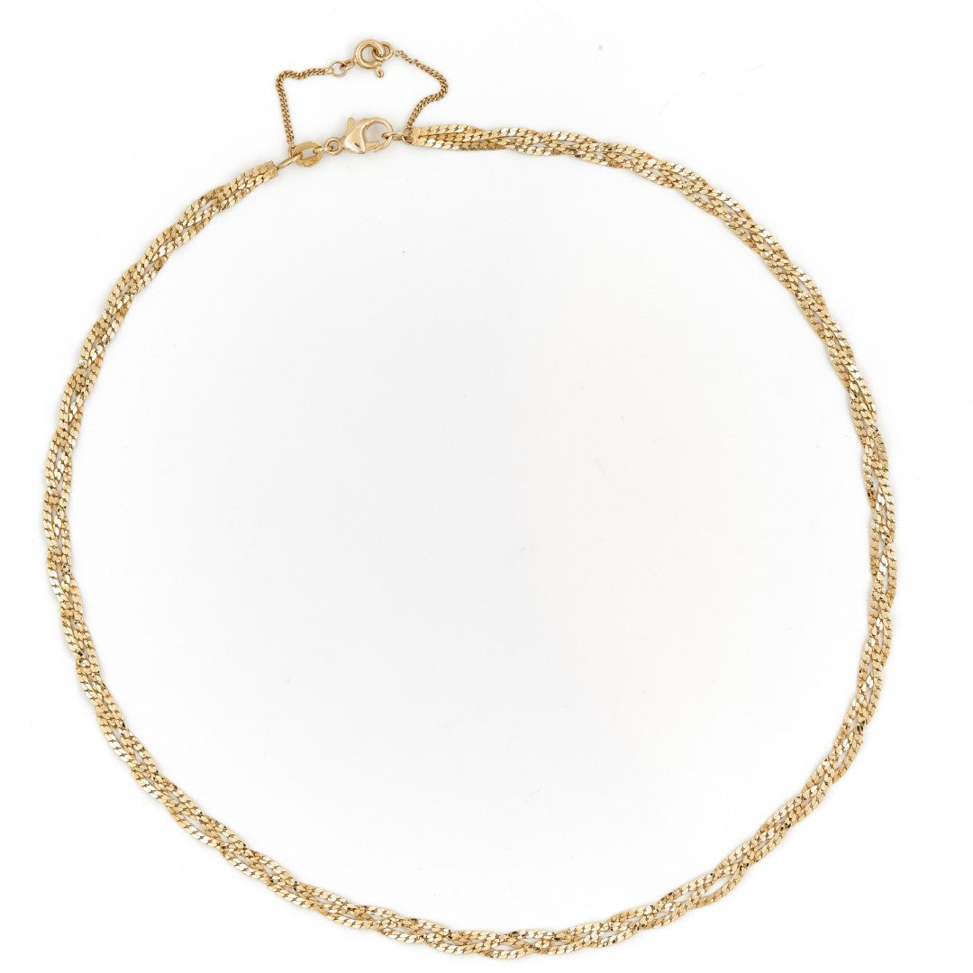 COLLIER ORJ NATTE GOURMETTE PLATECollier en or jaune 750 millièmes (18 carats), 3 chaines maille gourmette plate tréssées, longueur: 42 cm, largeur: 0,14, poids total: 12,34 g, poinçon hibou, excellent état.