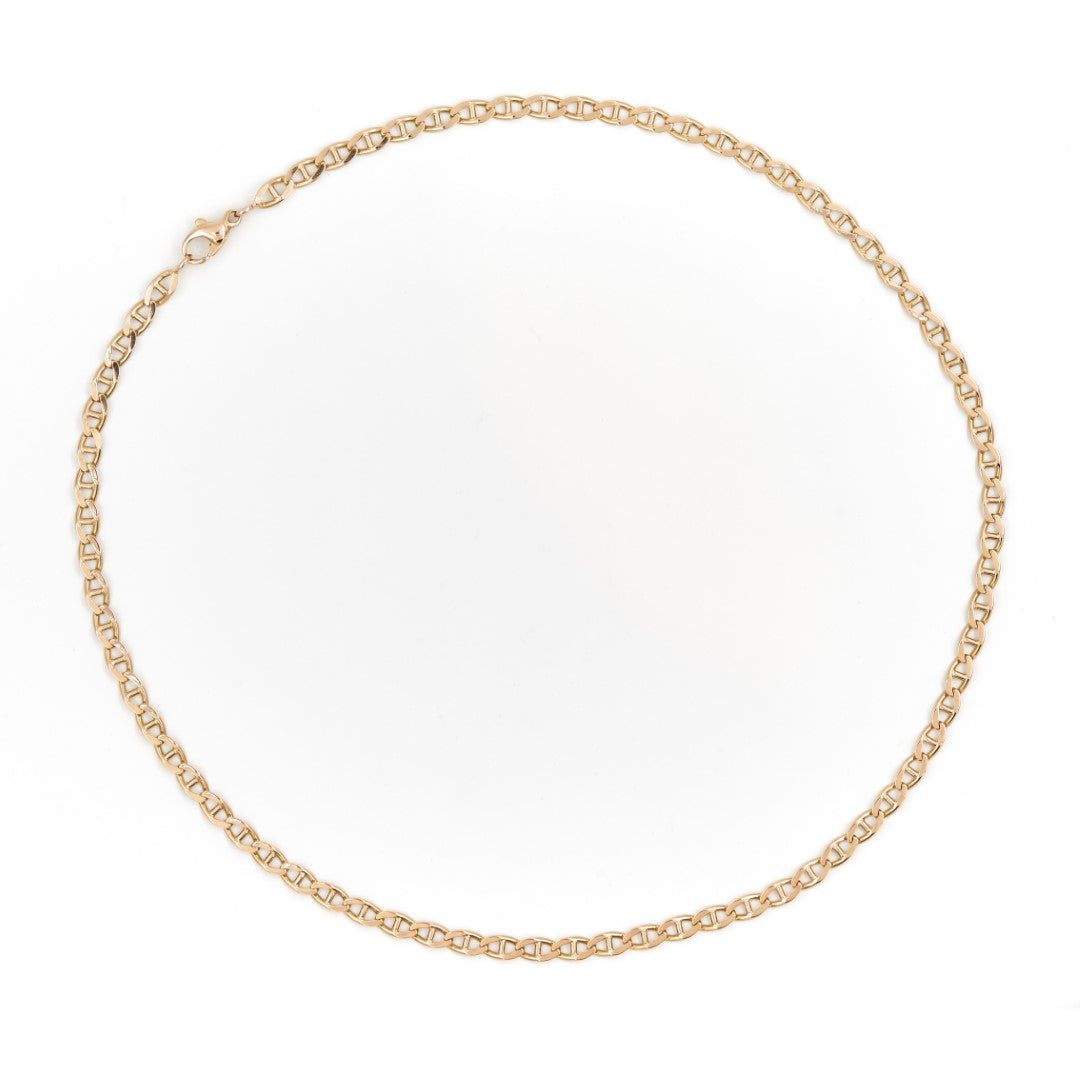 Collier en or jaune 750 millièmes (18 carats),chaine maille marine, longueur: 49,5 cm, largeur: 0,45 cm, poids total: 18,33 g, poinçon hibou, excellent état.