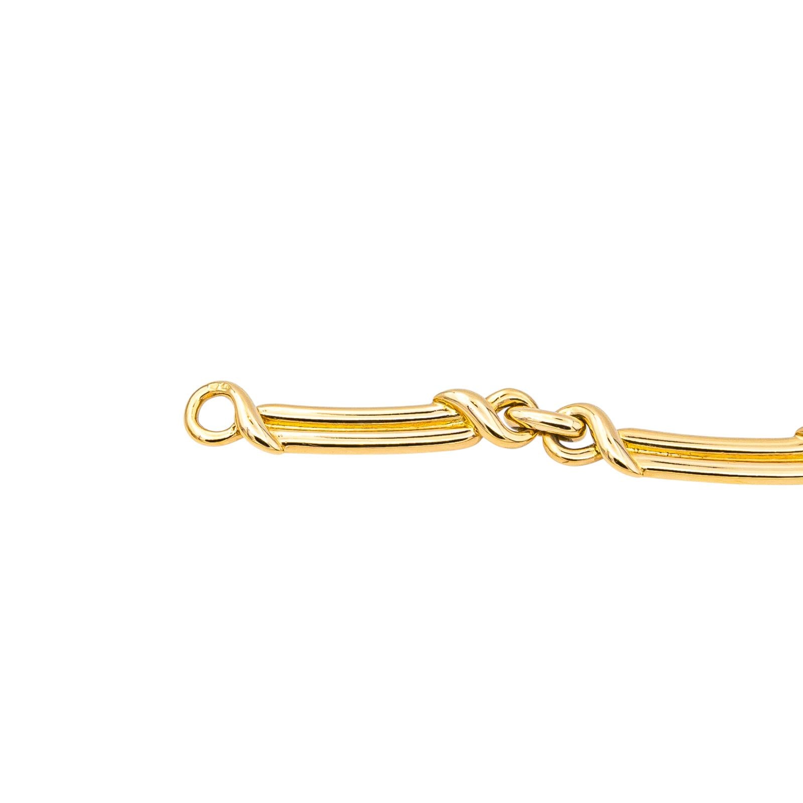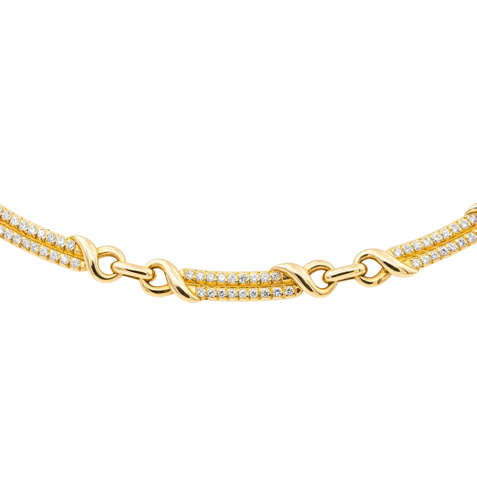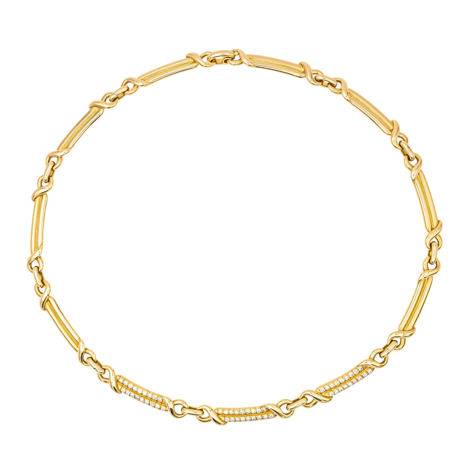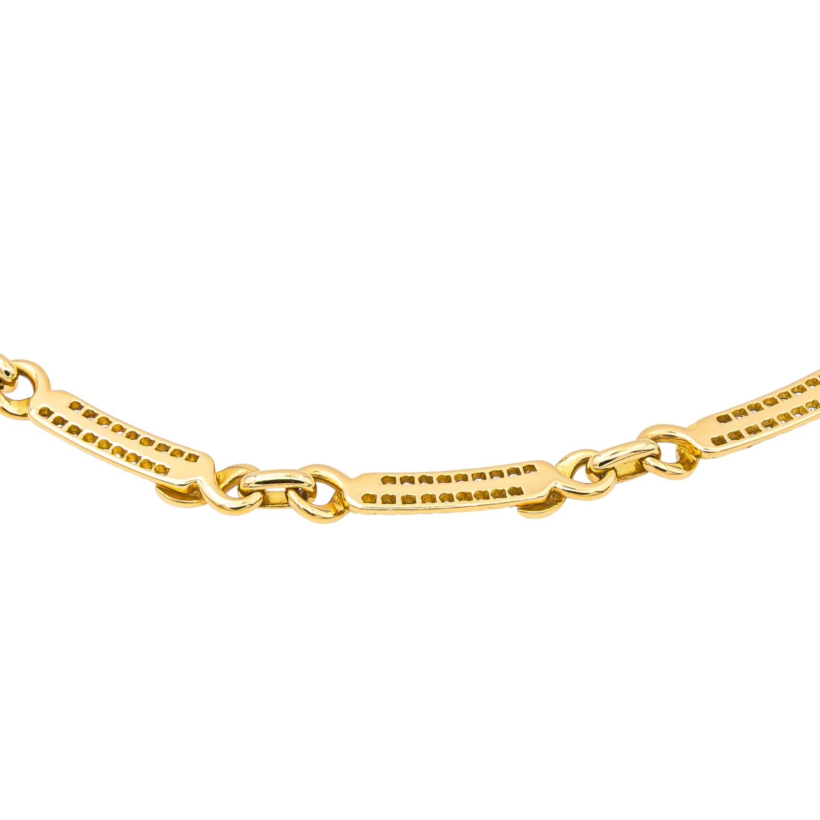 Necklace in 750 thousandths (18 carat) yellow gold, composed of articulated links, the 3 links in the center are paved with 18 diamonds each, brilliant cut approximately GH/VS, approximately 0.02 ct each, total number of diamonds: 54, total diamond weight: approximately 1.08 carats, length: 40.5 cm, width: 0.52 cm, dimensions of a link: 3.37 cm x 0.52 cm, total weight: 46.13 g, head hallmark eagle, excellent condition, Visible in Nice