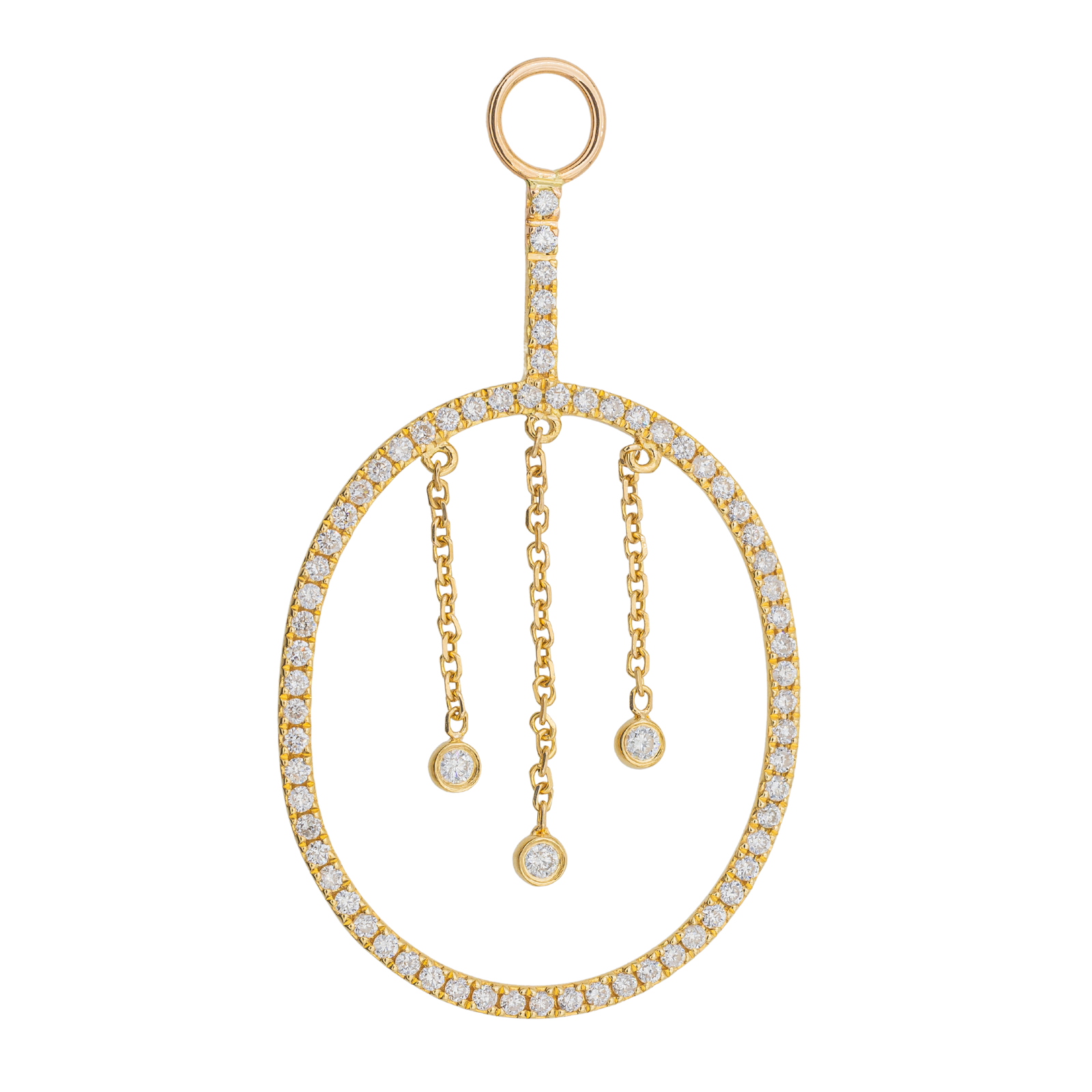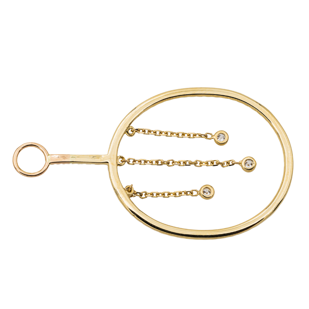 Pendentif en or jaune 750 millièmes (18 carats) testé, orné de 3 pampilles mobiles, serti de 70 diamants taille brillant, environ H-VS, pour un poids total d'environ 0,45 ct (3 diamants pesant environ 0,015 ct chacun et 67 diamants pesant environ 0,006 ct chacun), dimensions avec bélière : 4,17 cm x 2,32 cm, poids total : 1,56 g, en excellent état.