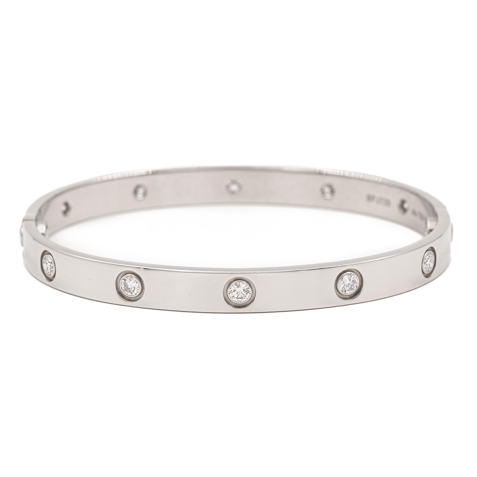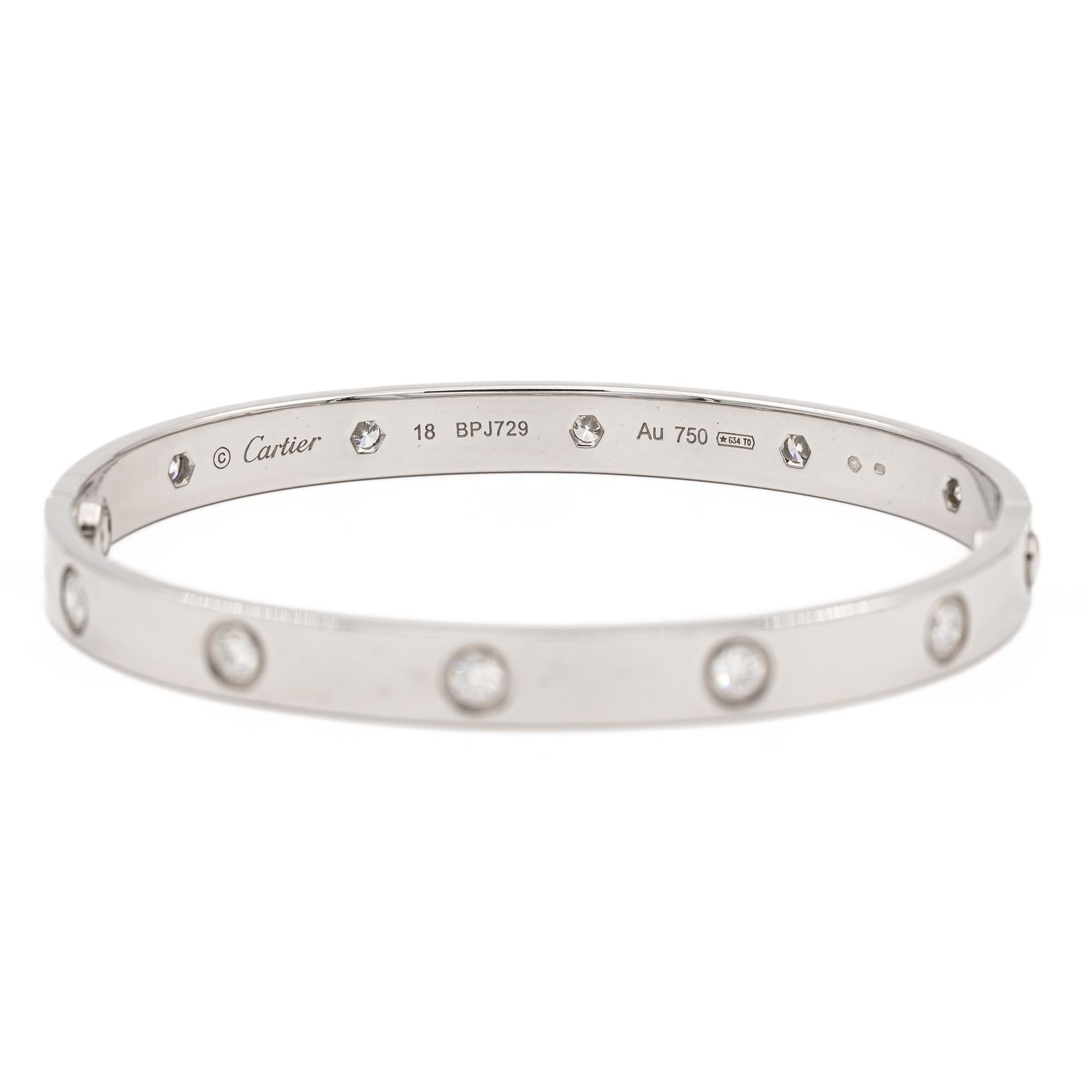 Bracelet jonc signé de la Maison Cartier, modèle Love, en or blanc 750 millièmes (18 carats), serti de 10 diamants taille brillant estimés F/VS, chaque diamant d'un poids d'environ 0,096 ct, poids total des diamants: 0,96 ct, largeur: 0,61 cm, longueur: 18 cm, poids total: 33,04 g, poinçon Saint Bernard, numéroté: BPJ729, vendu avec l'écrin et le tournevis, valeur neuf: 20 200 €, excellent état