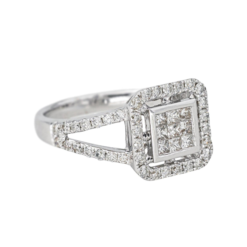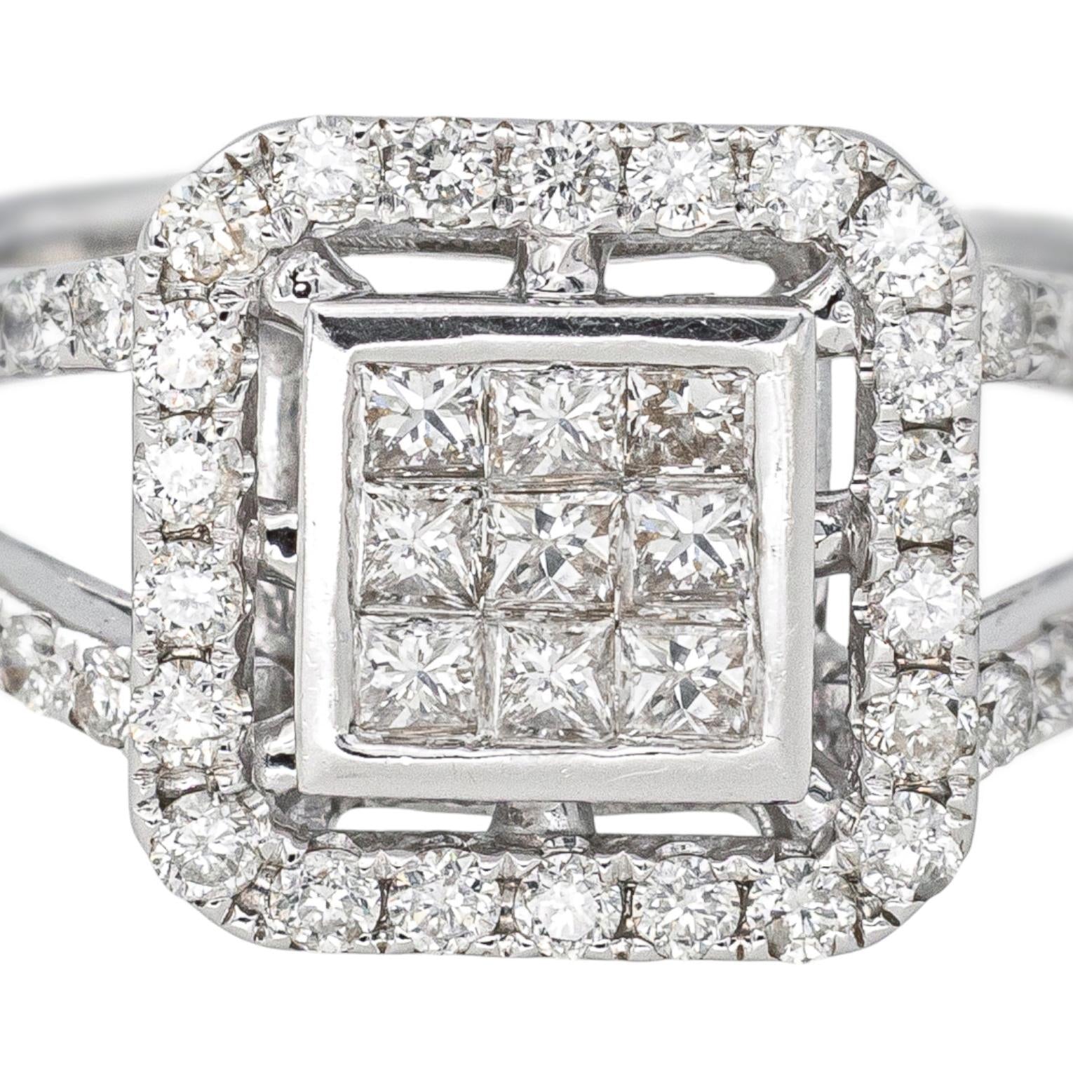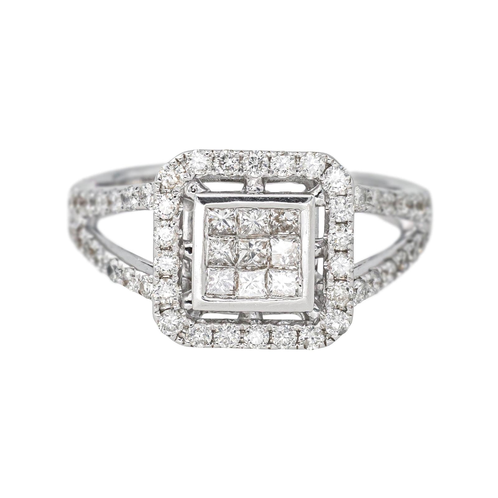 Bague en or blanc 750 millièmes (18 carats), pavée de diamants, 9 diamants taille carré, environ I-SI, d'un poids total d'environ 0,36 ct, (chaque diamant d'un poids d'environ 0,04 ct) entourés de 22 diamants taille brillant, environ I-SI, d'un poids total d'environ 0,22 ct (chaque diamant d'un poids d'environ 0,01 ct), poids total diamant : 0,58 ct, largeur sur le dessus : 1,13 cm, tour de doigt : 56, poids total : 4,74 g, poinçon tête d'aigle, excellent état