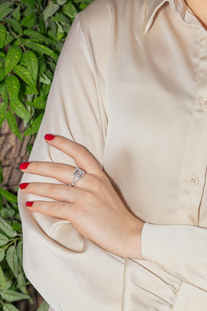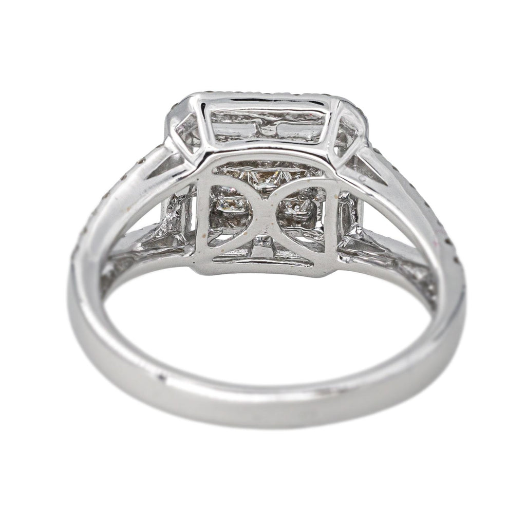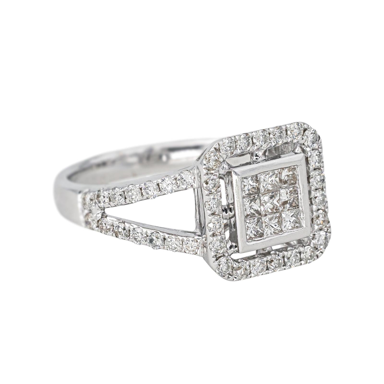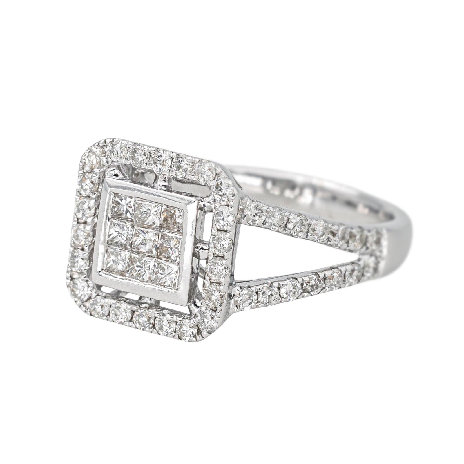Bague en or blanc 750 millièmes (18 carats), pavée de diamants, 9 diamants taille carré, environ I-SI, d'un poids total d'environ 0,36 ct, (chaque diamant d'un poids d'environ 0,04 ct) entourés de 22 diamants taille brillant, environ I-SI, d'un poids total d'environ 0,22 ct (chaque diamant d'un poids d'environ 0,01 ct), poids total diamant : 0,58 ct, largeur sur le dessus : 1,13 cm, tour de doigt : 56, poids total : 4,74 g, poinçon tête d'aigle, excellent état