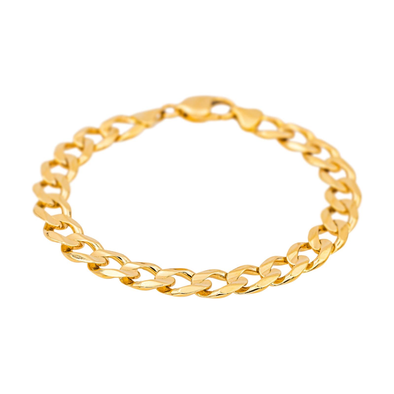Bracelet en or jaune 750 millièmes (18 carats), maille gourmette, longueur : 21 cm, largeur : 0,86 cm, épaisseur : 0,23 cm, poids total : 27,62 g, fermoir mousqueton, poinçon hibou, excellent état