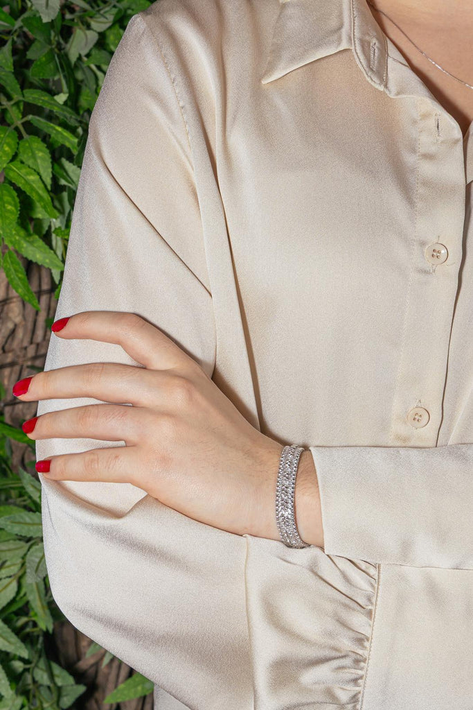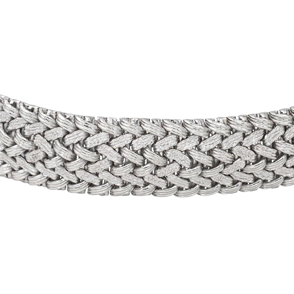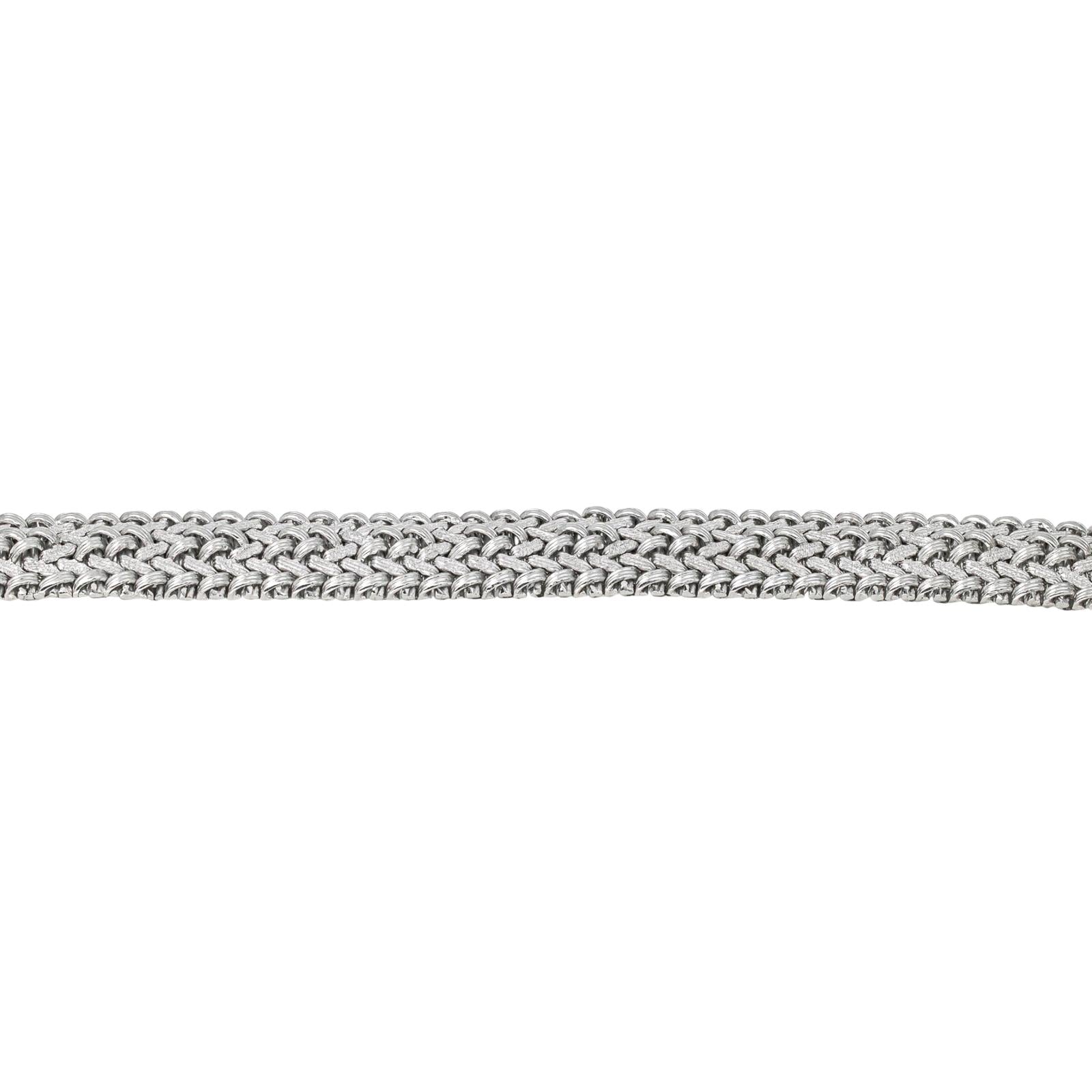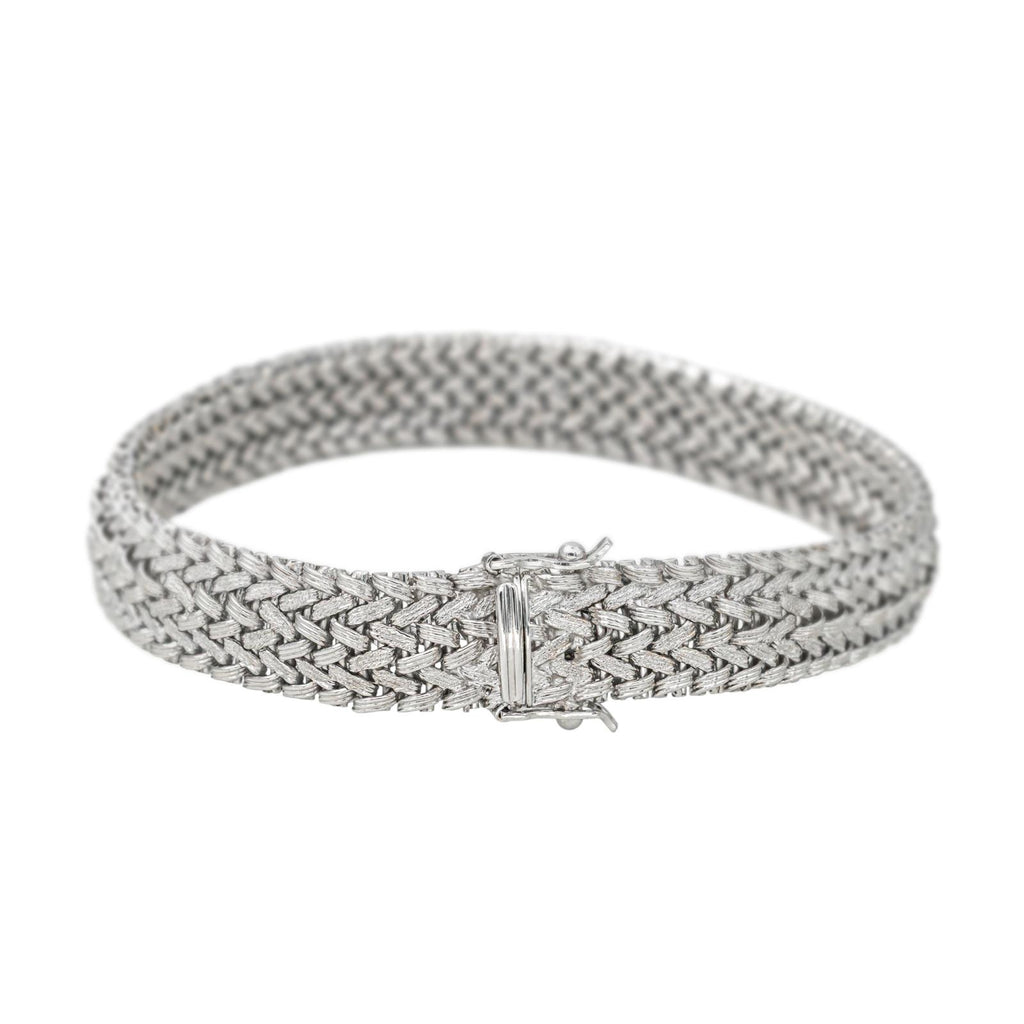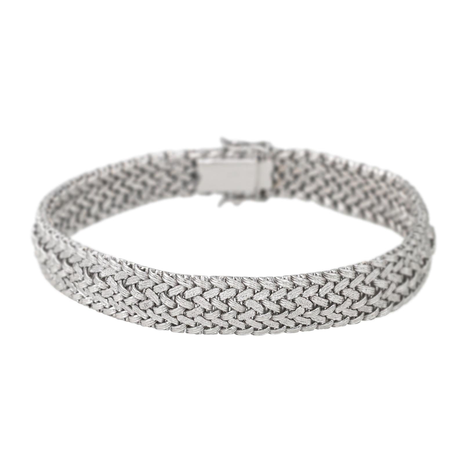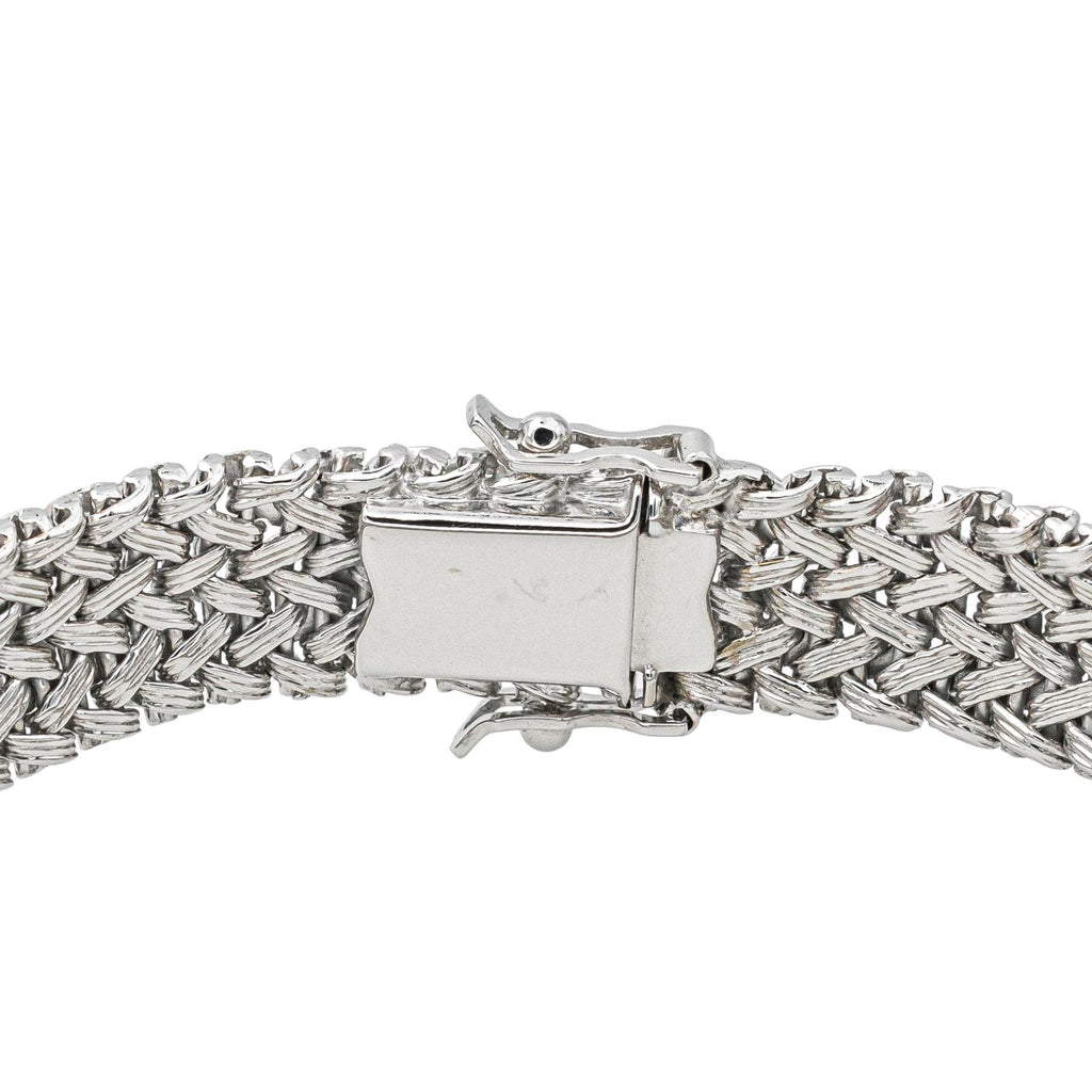 Bracelet en or blanc 750 millièmes (18 carats), maille fantaisie, longueur : 18,50 cm, largeur : 0,98 cm, épaisseur : 0,30 cm, poids total : 30,98 g, fermoir languette avec huit de sécurité, poinçon hibou, excellent état