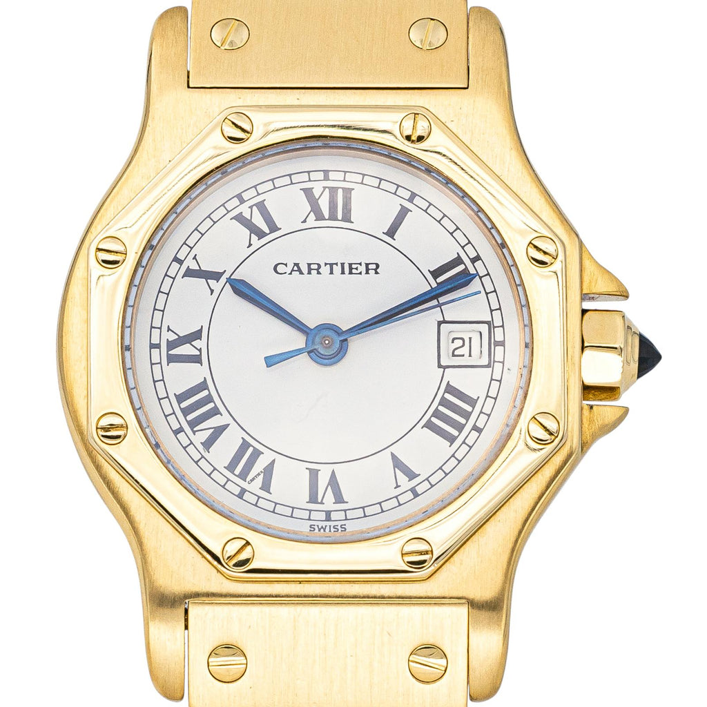 Montre Cartier modèle "Santos octogonale", en or jaune "750 millièmes" (18 carats), n°série 296900335, cadran blanc à chiffres romains, mouvement mécanique à remontage manuel, boîtier 30 mm, verre saphir, bracelet en or boucle déployante (taille poignet 19,50 cm, largeur bracelet 1,36 cm), poids total : 99,21 g, années 1990, vendue avec 3 maillons en or, révision complète et garantie 1 an, poinçon hibou, excellent état