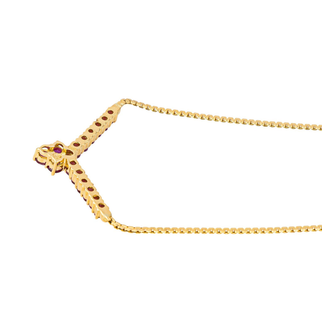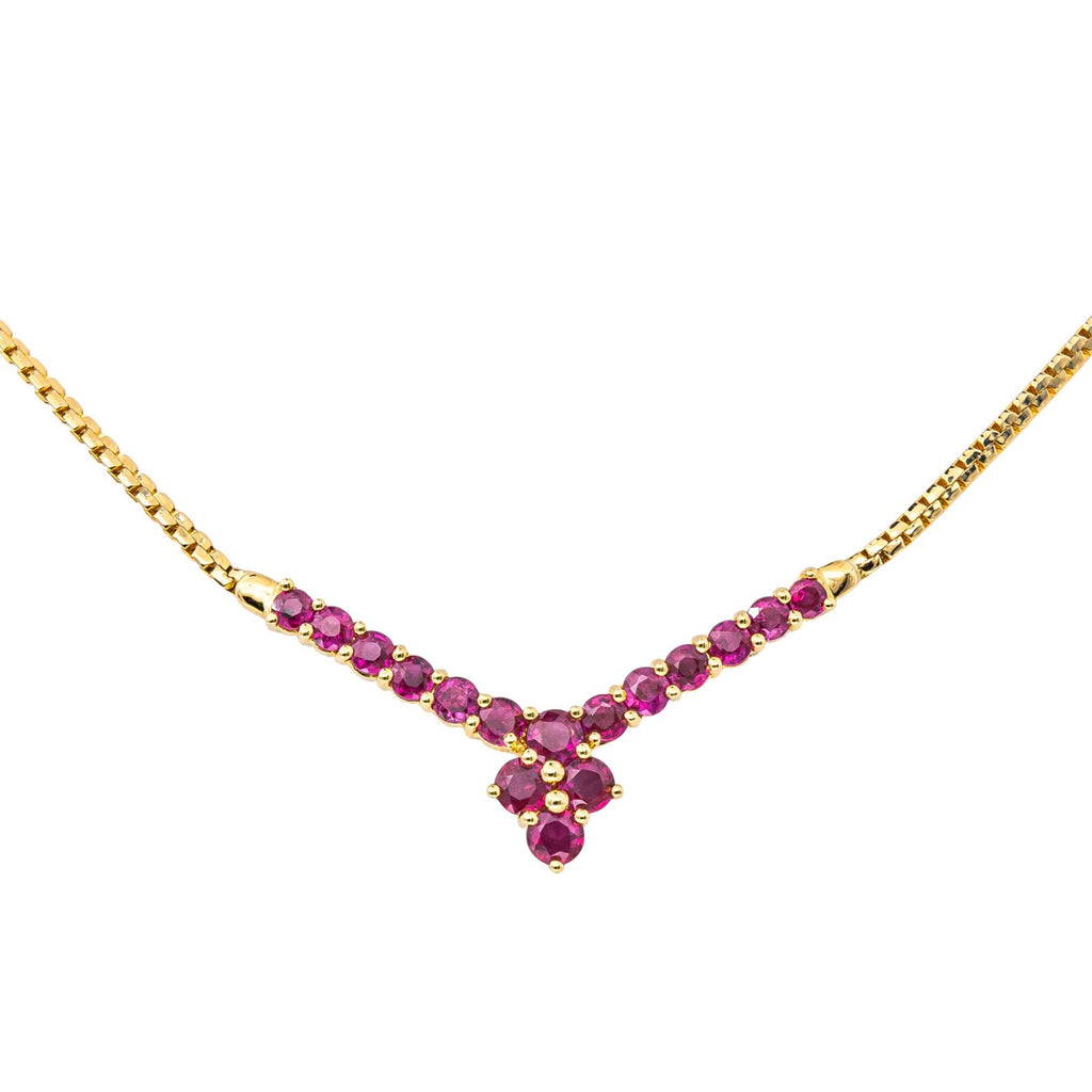 Collier en or jaune 750 millièmes (18 carats), motif serti de rubis, taille rond, poids total rubis : environ 1,20 ct, 12 rubis de 0,06 ct environ chacun et 4 rubis de 0,12 ct environ chacun, maille jaseron, longueur : 39,50 cm, largeur de la chaîne : 0,10 cm, longueur de la partie comprenant les motifs : 3,30 cm, largeur : 1,60 cm, poids total : 7,10 g, poinçon hibou, excellent état