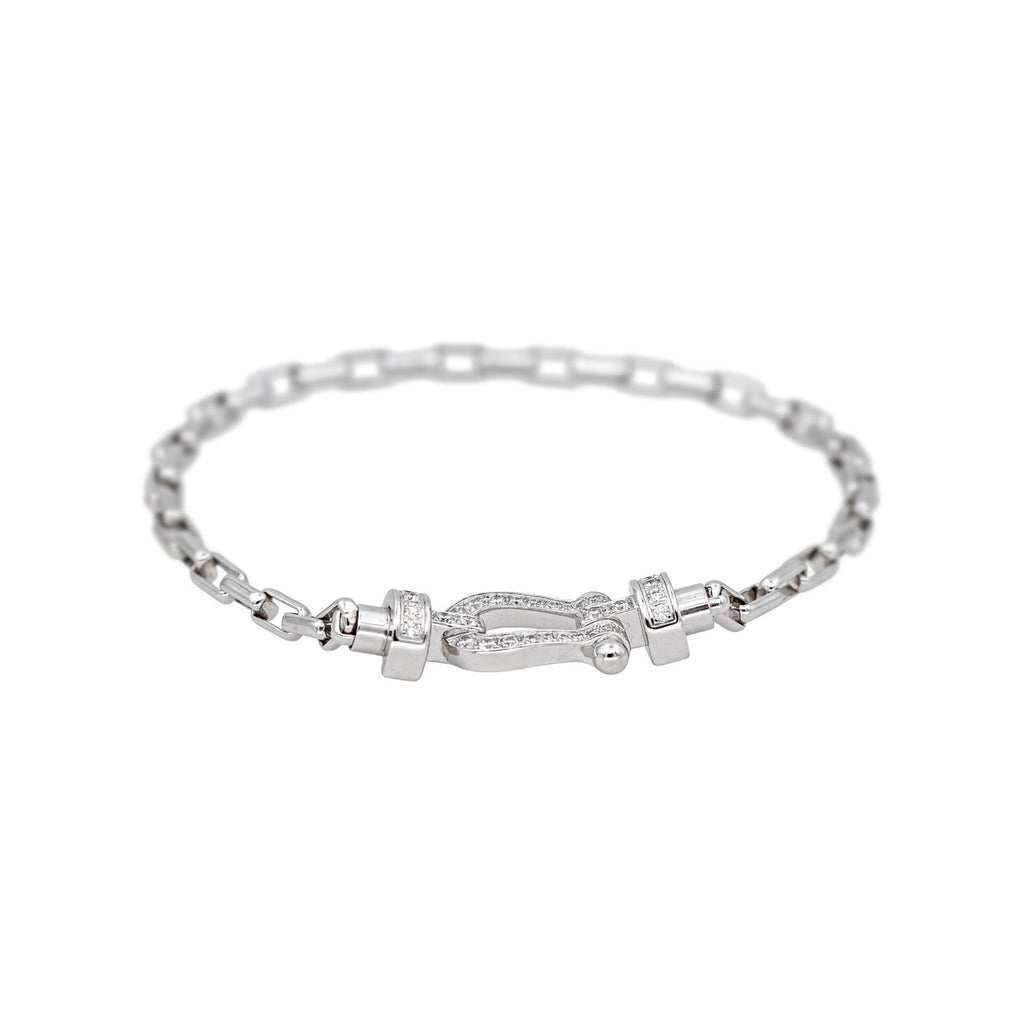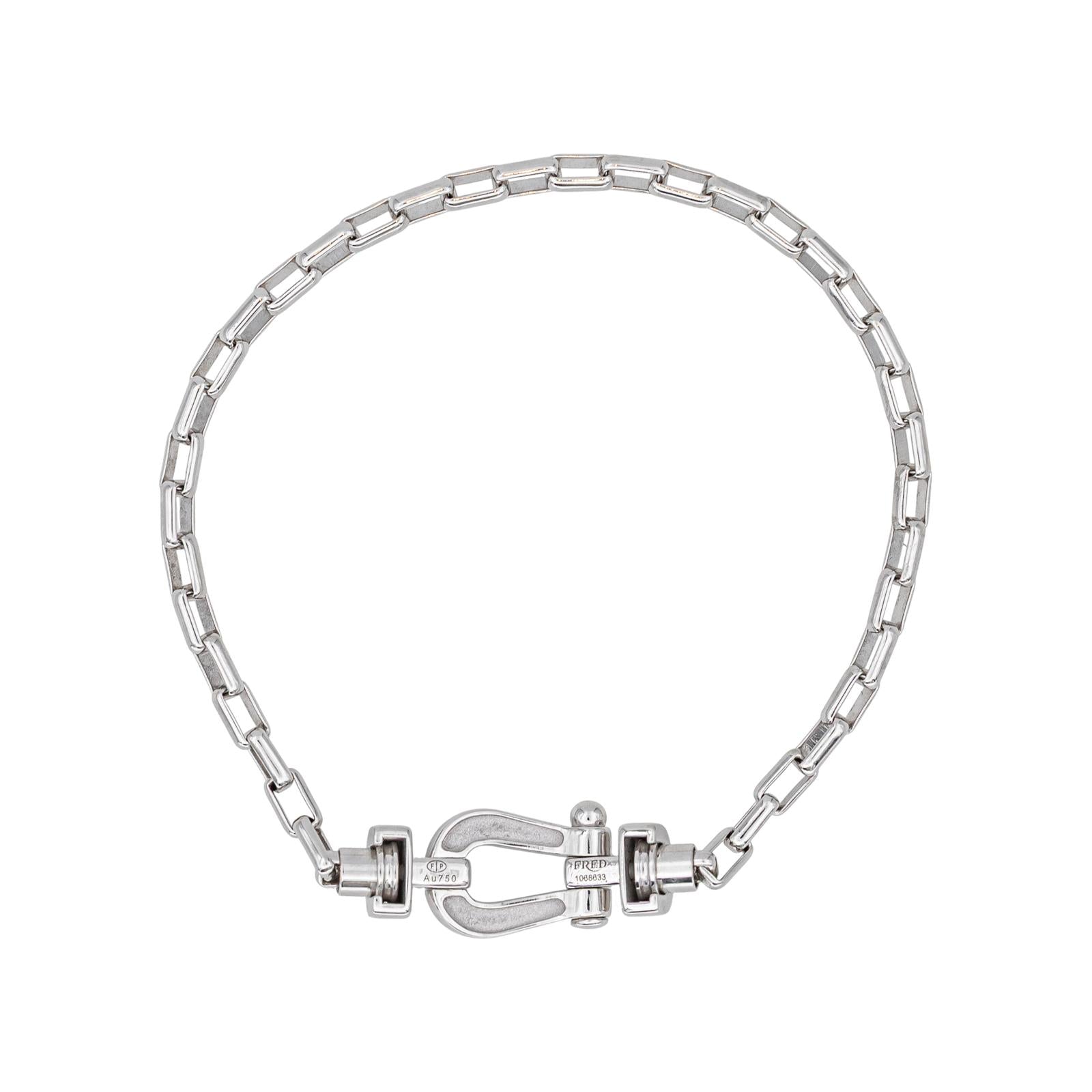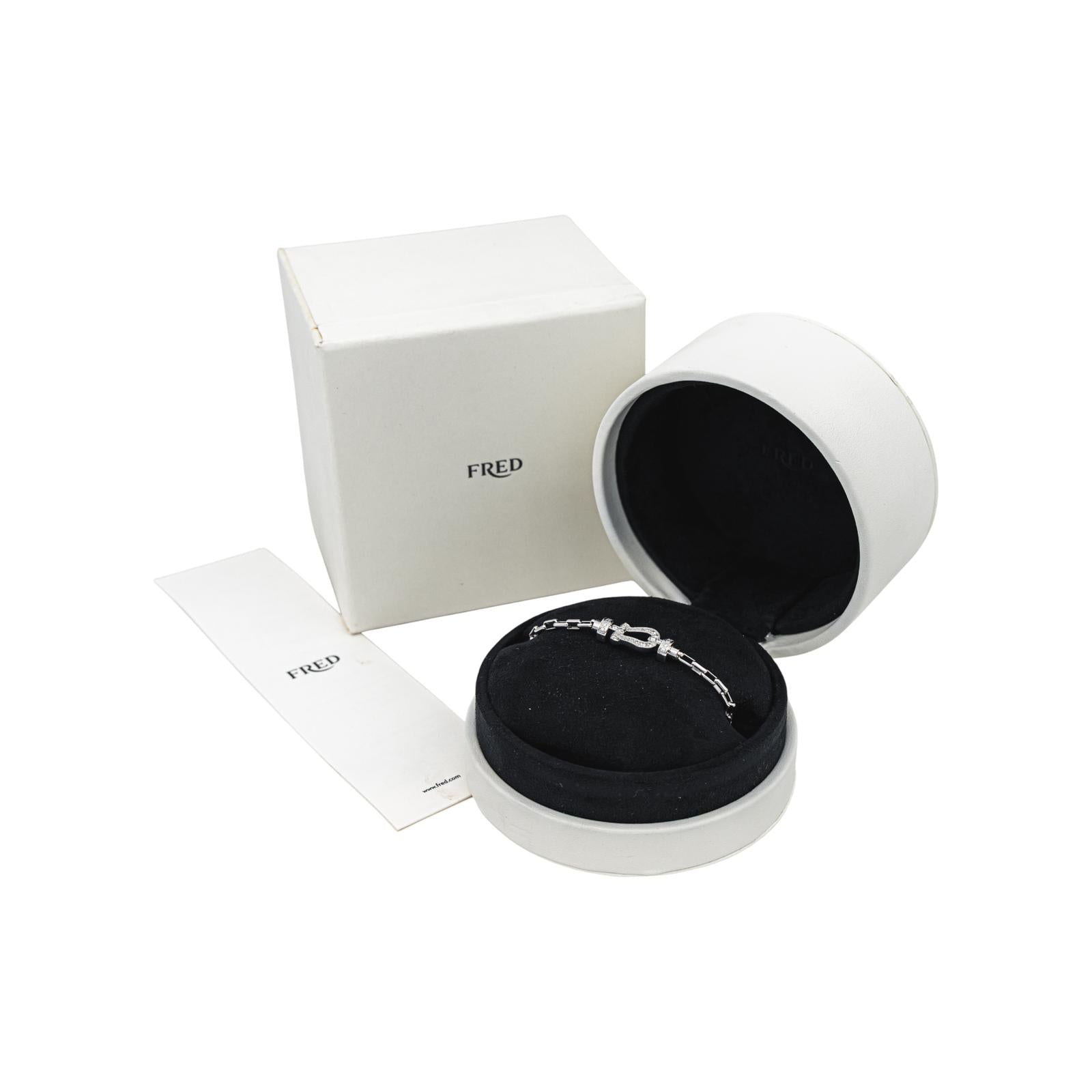 Bracelet signé de la Maison Fred en or blanc 750 millièmes (18 carats), modèle Force 10, serti de diamants, taille brillant, environ G-VS, d'un poids total d'environ 0,25 ct, dimensions de la maille : 15 cm x 0,27 cm, dimensions de la manille : 2 x 1 cm, poids total : 8,67 g, poinçon tête d’aigle, vendu avec écrin d’origine, numéroté : 1068633, excellent état