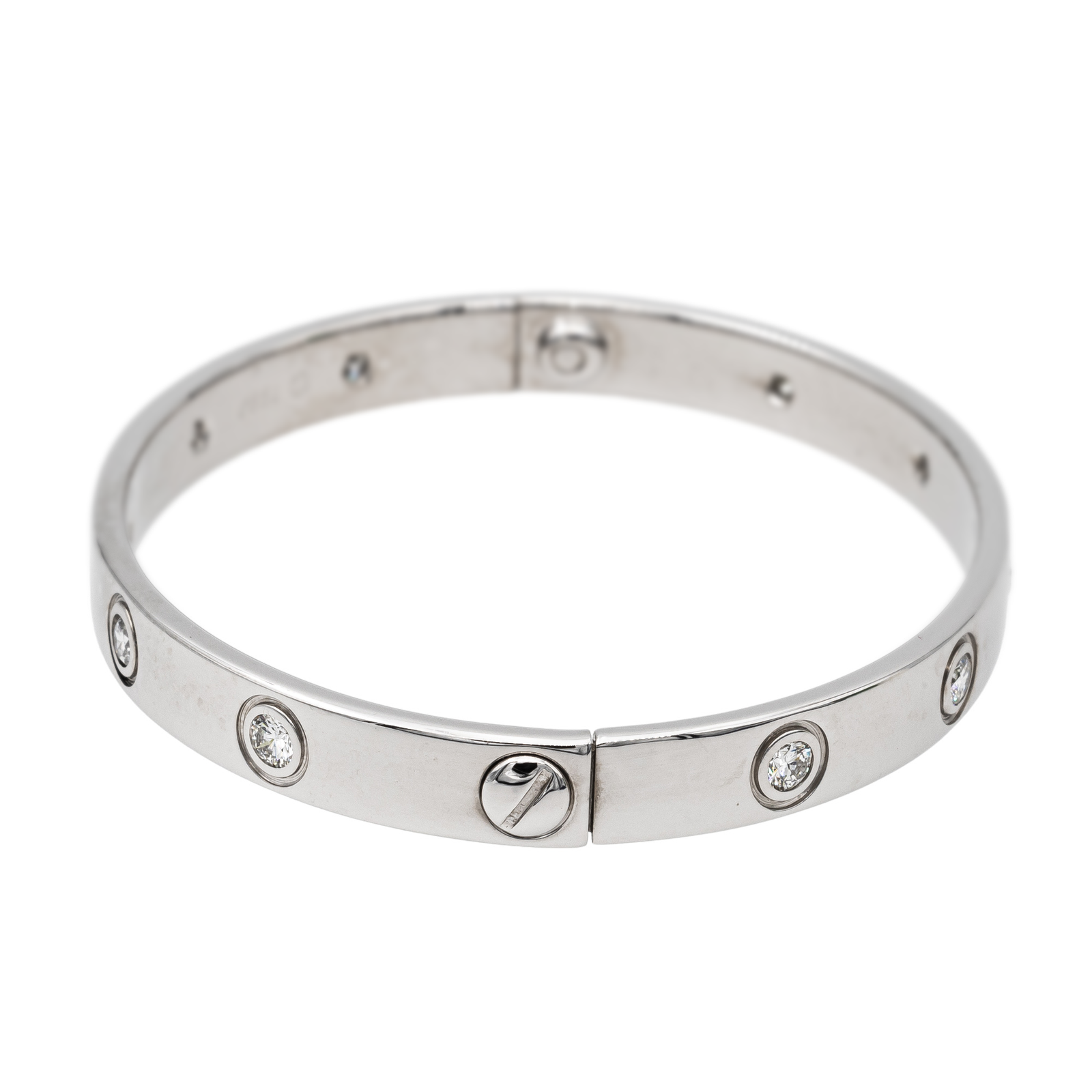 Bracelet jonc signé de la Maison Cartier, modèle "Love", en or blanc 750 millièmes (18 carats), serti de 10 diamants taille brillant estimés F/VS, chaque diamant d'un poids d'environ 0,096 ct, poids total des diamants: 0,96 ct, largeur: 0,61 cm, longueur: 16 cm, poids total: 27,40 g, poinçon hibou, numéroté: E22704, vendu avec écrin Cartier et tournevis, prix neuf: 20 200 €, excellent état