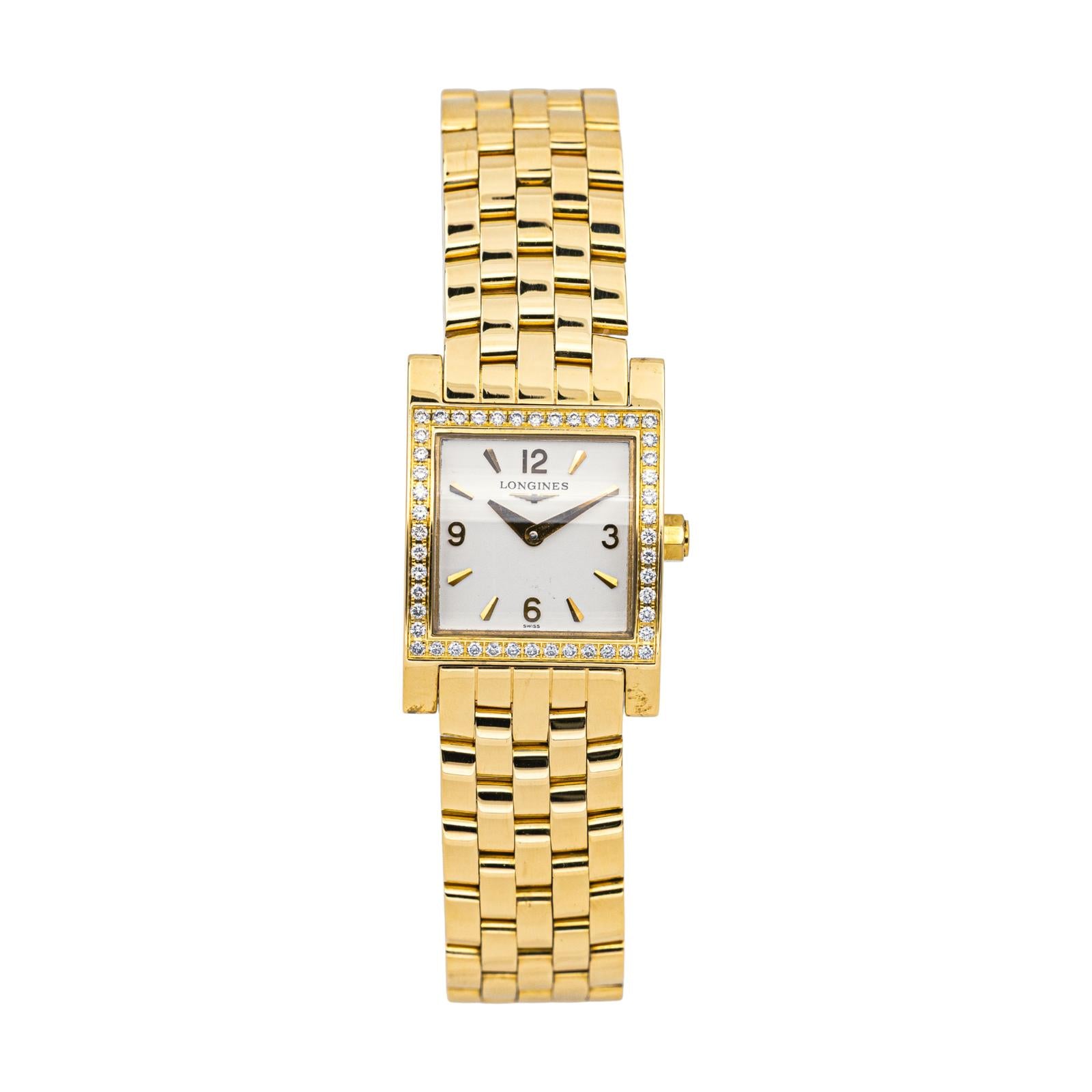 Montre Longines modèle Dolce Vita square L5.166.7 en or jaune 750 millièmes (18 carats), n°série 29993285, cadran blanc à chiffres romains, sertie de 48 diamants taille brillant, environ H-VS, poids total de diamant environ 0,48ct (chaque diamant d'un poids d'environ 0,01ct), mouvement quartz, boîtier 21 mm, verre saphir, bracelet en or jaune, fermoir papillon, taille poignet 15,00 cm, largeur bracelet 1,50 cm, poids total : 75,12 g, années 2000, révision complète et garantie 1 an, excellent état