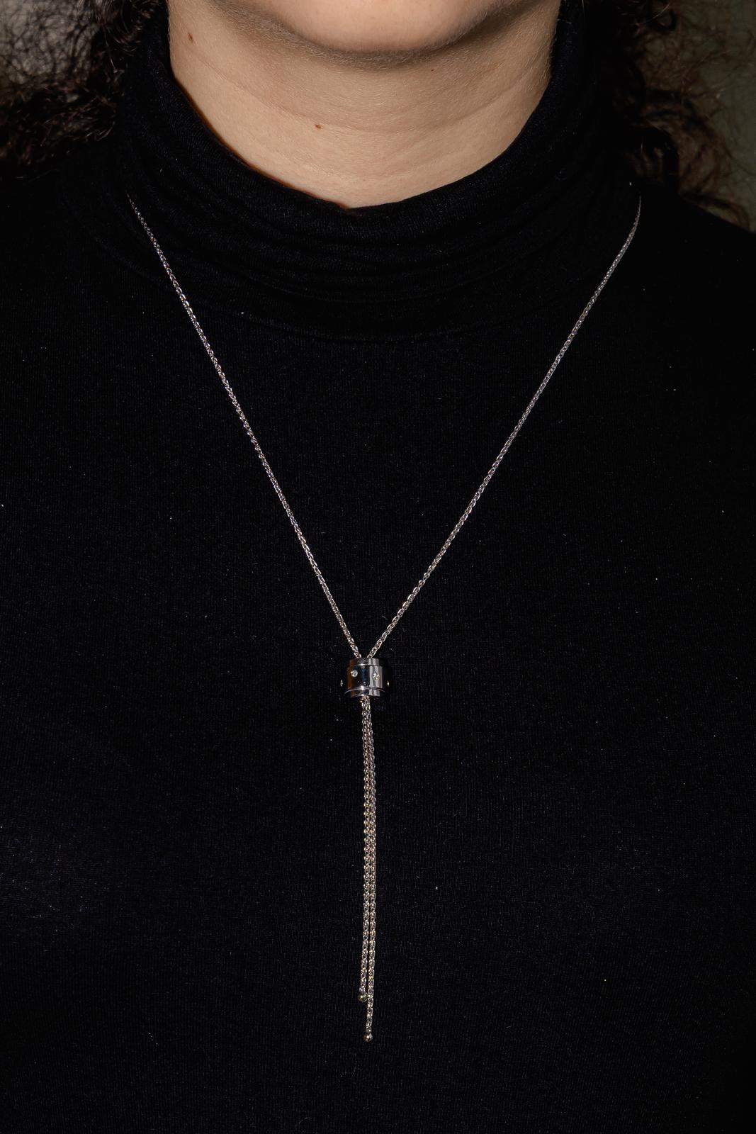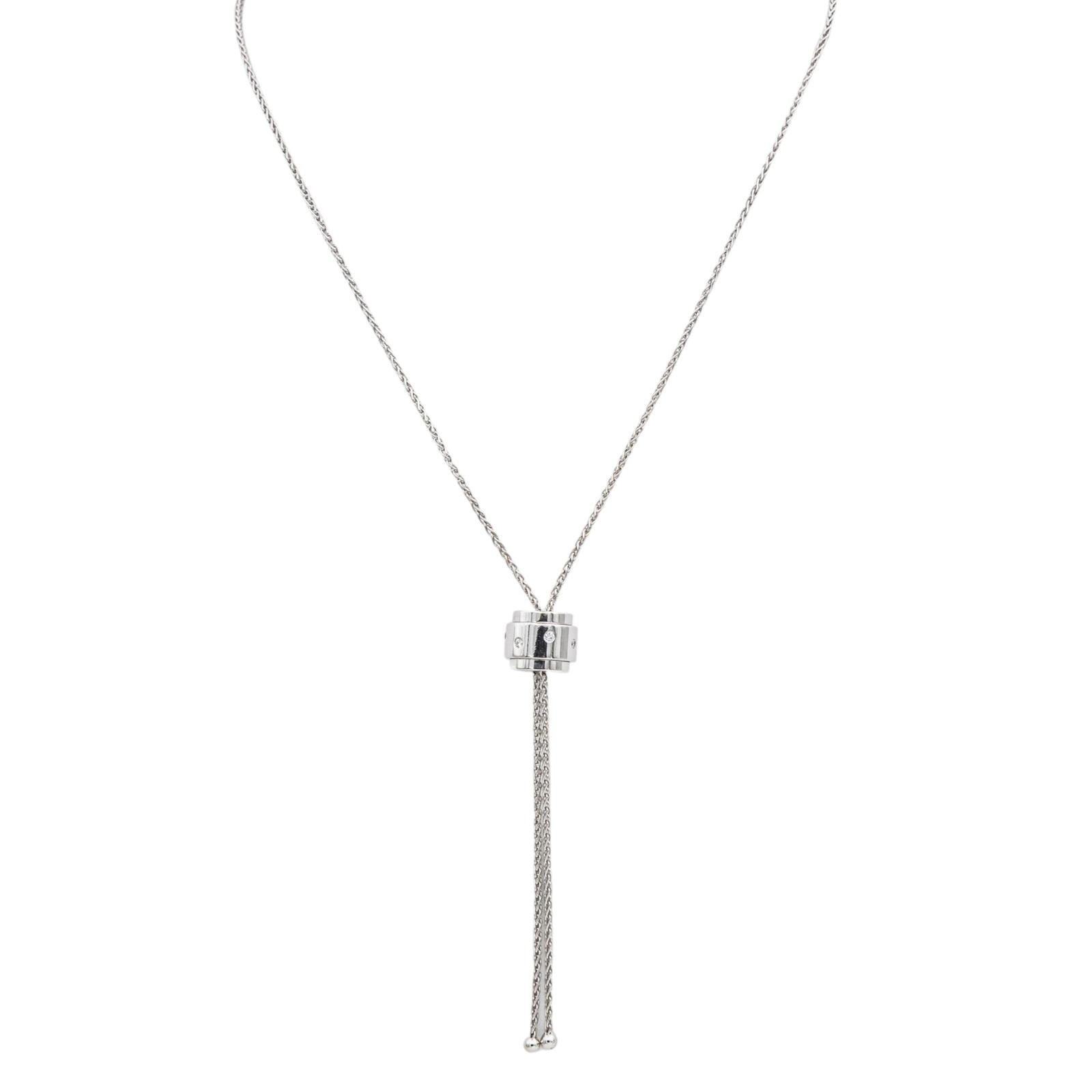 Collier négligé signé de la Maison Piaget, collection possession, en or blanc 750 millièmes (18 carats), motifs géométriques sertis de 7 diamants, taille brillant, environ H-VS, d'un poids total d'environ 0,07 ct, (chaque diamant d'un poids d'environ 0,01 ct), maille palmier, longueur : 37,50 cm, largeur de la chaîne : 0,10 cm, longueur de la partie comprenant les motifs : 1 cm, largeur : 1 cm, poids total : 17,77 g, numéro de série : B53514, poinçon saint Bernard, excellent état