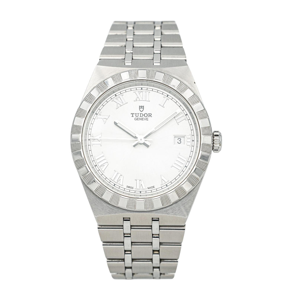 Montre signée de la Maison Tudor, modèle Royal en acier, réf 28500, n°série Q369316, cadran silver à chiffres romains, mouvement mécanique à remontage automatique, boîtier 38 mm, verre saphir, bracelet acier boucle déployante (taille poignet 21 cm, largeur bracelet 23,00 cm), poids total : 130,42 g, full set (boite et papier d'origine), année 2021, révision complète et garantie 1 an, excellent état