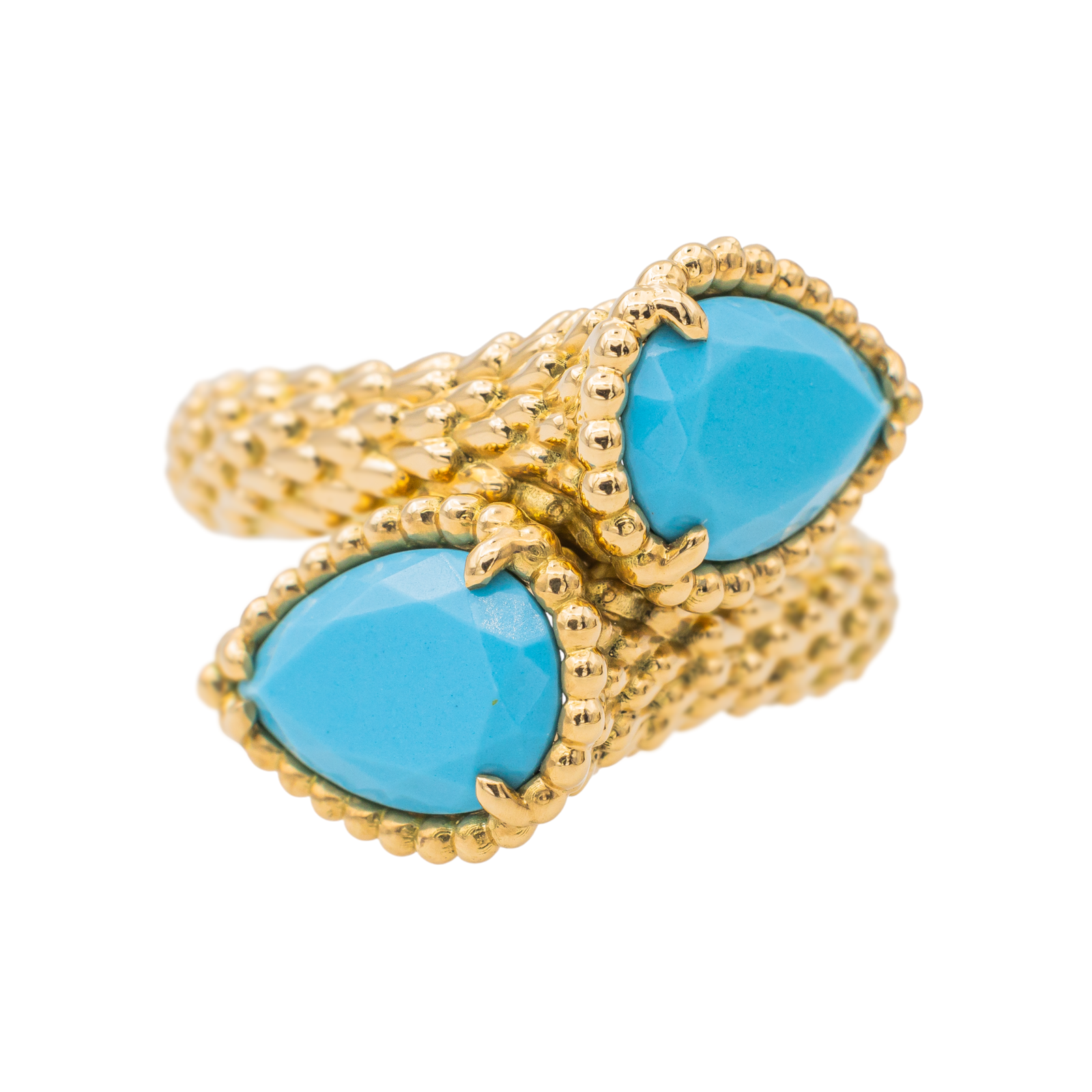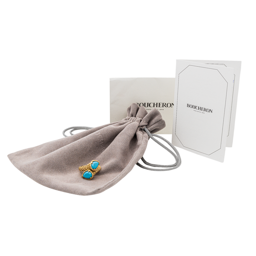 Bague signée de la Maison Boucheron, collection Serpent Bohème, en or jaune 750 millièmes (18 carats), modèle toi & moi, sertie de deux turquoises taillées en poire, taille 52, numérotée, poids total: 10,95 g, Pochon et certificat d'origine, excellent état, poincon hibou, jamais portée.