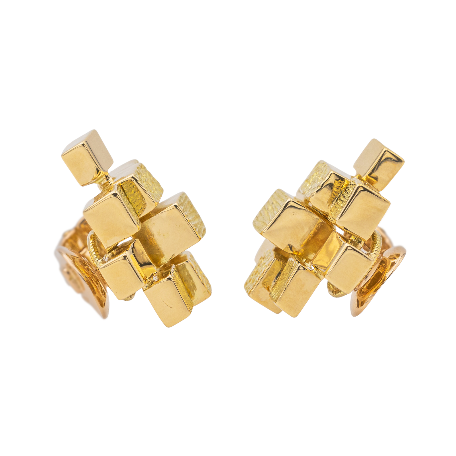 Boucles d’oreilles clips signée de la Maison Mauboussin et Georges Lenfant, années 1970, en or jaune 750 millièmes (18 carats), modèle Cube, dimensions : 1,91 cm x 2,00 cm, poids total : 16,36 g, poinçon tête d'aigle, poinçon de Maitre Georges Lenfant, années 70, excellent état