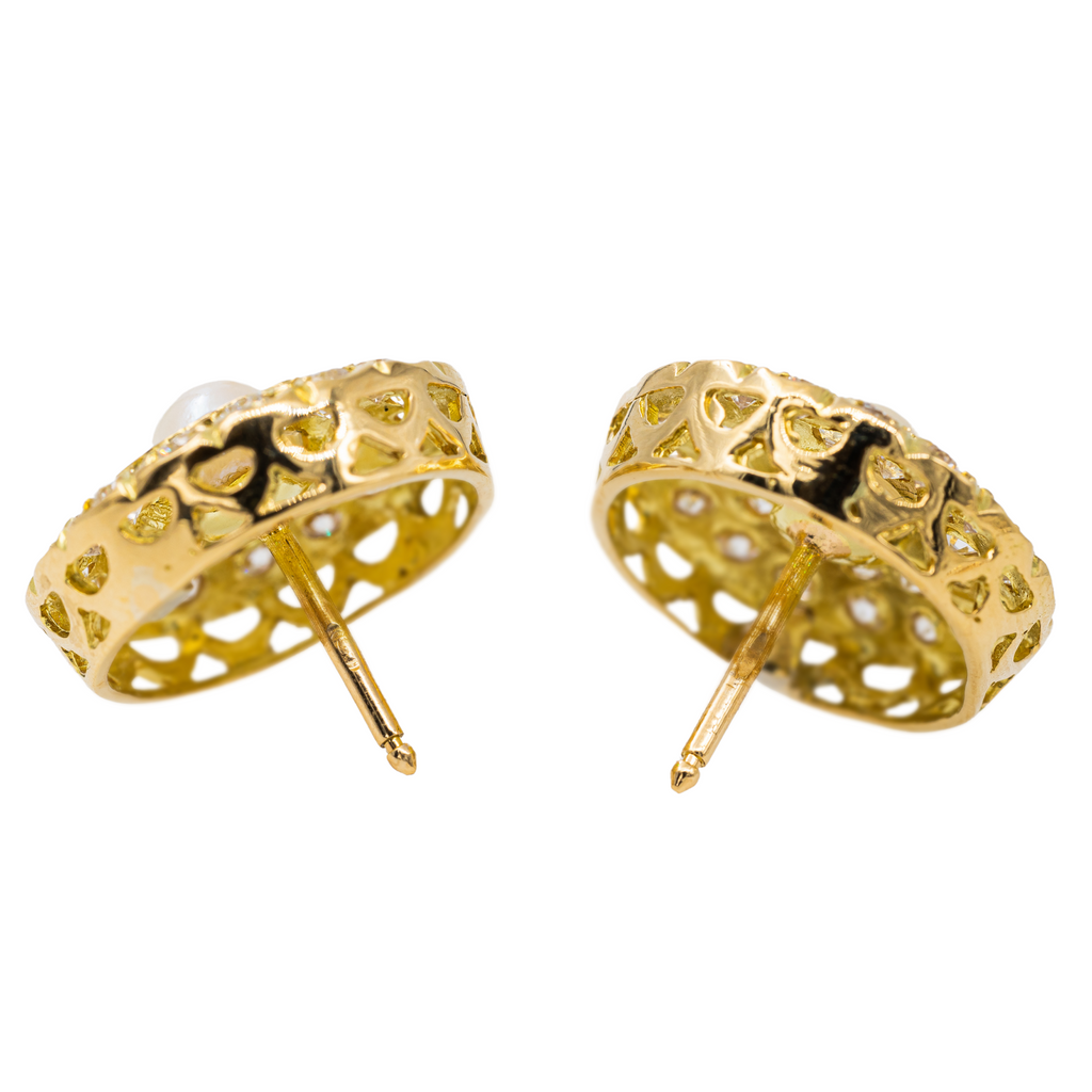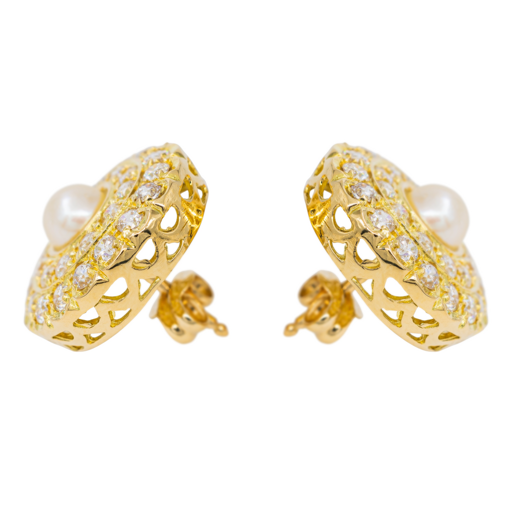 Boucles d’oreilles en or jaune 750 millièmes (18 carats), serties de 2 perles de 0,54 cm de diamètre, et 56 diamants taille brillant, estimés H/VS, poids total des diamants: environ 2,00 cts, diamètre: 1,71 cm, poids total: 8,15 g, poinçon hibou, excellent état