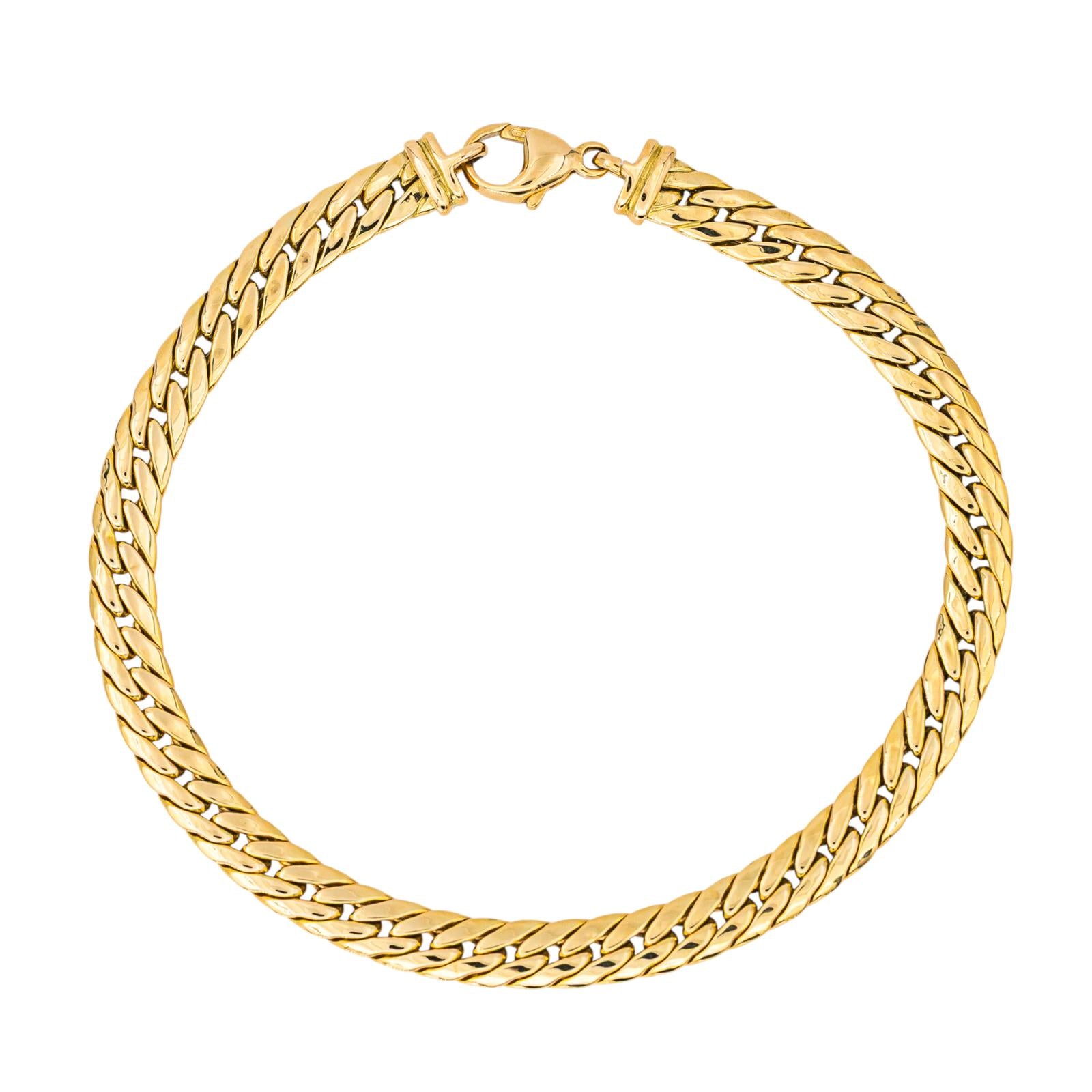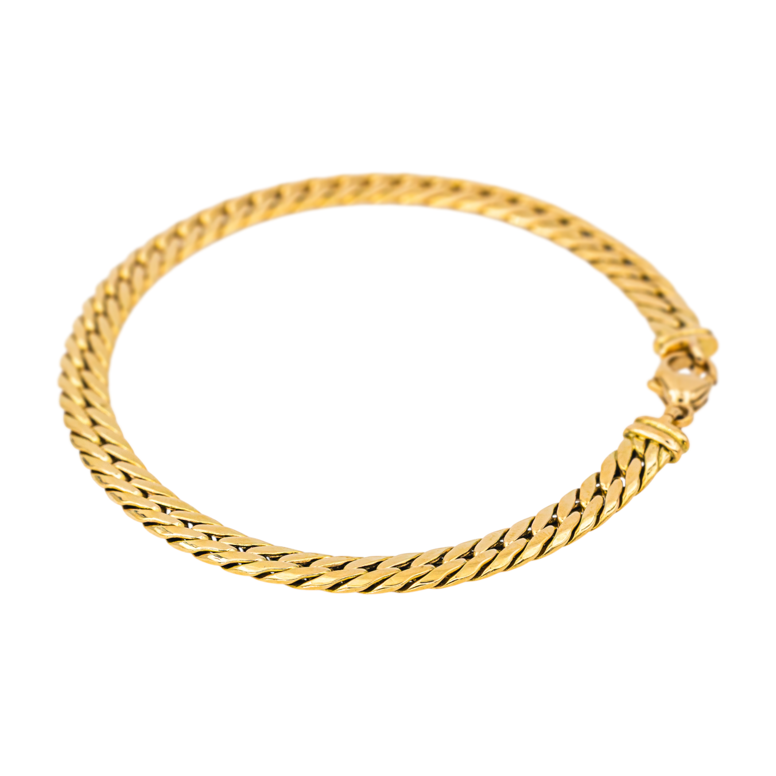 Bracelet en or jaune 750 millièmes (18 carats), maille anglaise, longueur : 19,50 cm, largeur : 0,50 cm, épaisseur : 0,18 cm, poids total : 8,97 g, poinçon tête d’aigle, excellent état