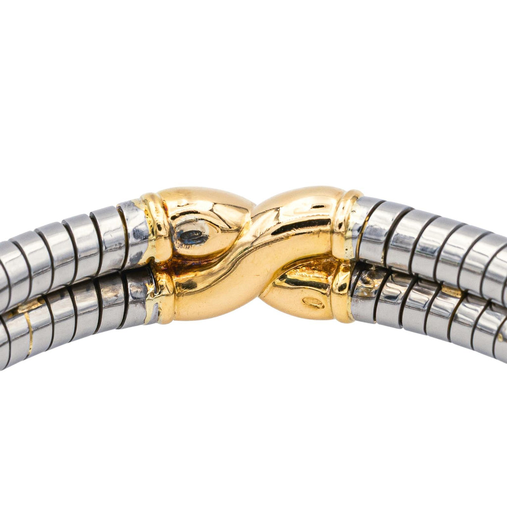Bracelet jonc signé de la Maison Bulgari en or jaune 750 millièmes (18 carats) et acier, maille tubogas, diamètre intérieur : 5,44 cm x 4,82 cm, largeur : 1,20 cm, longueur : 19,50 cm, poids total : 35,75 g, poinçon hibou, vendu avec pochette d'origine et d'époque, excellent état