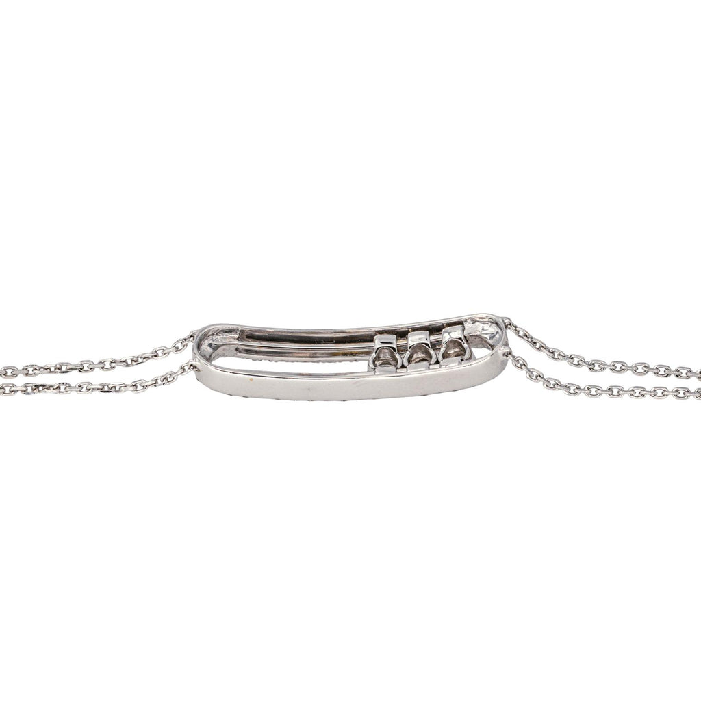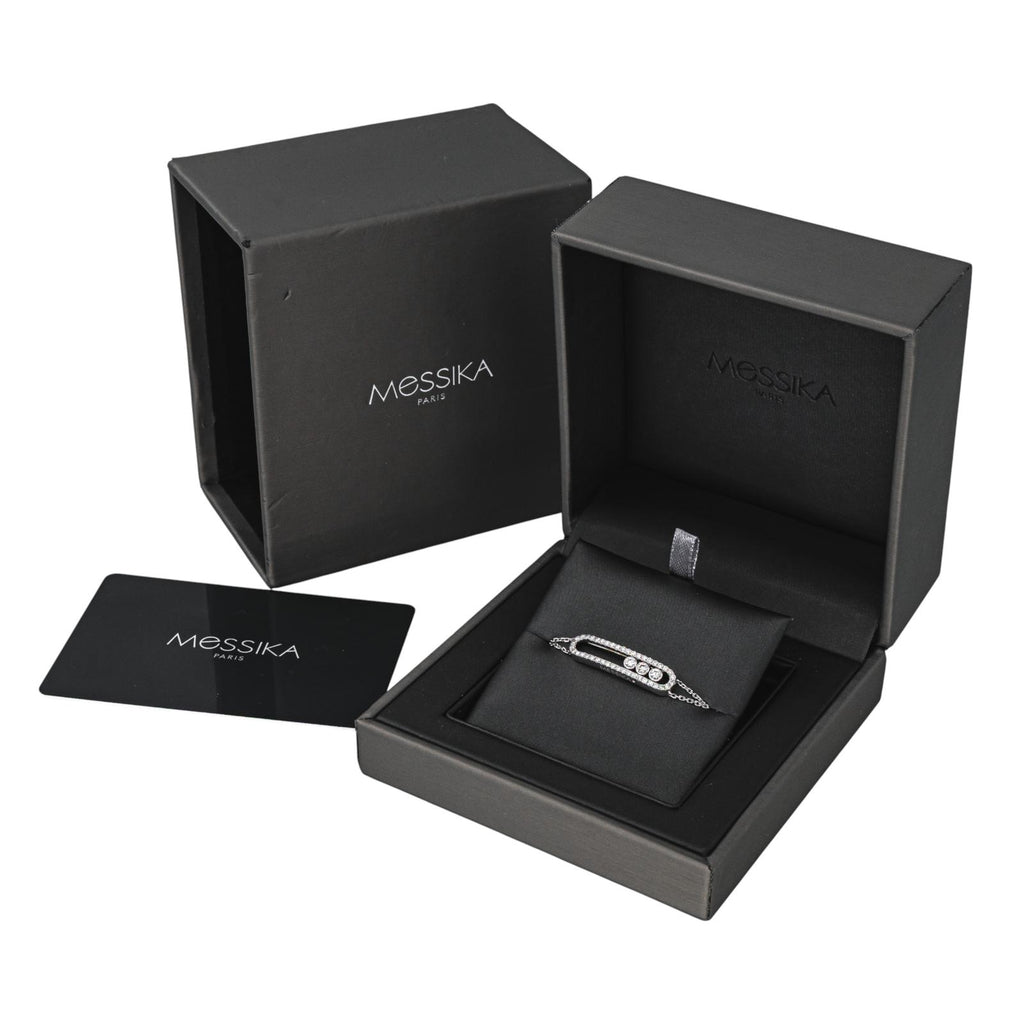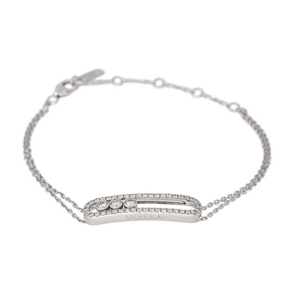 Bracelet signé de la Maison Messika en or blanc 750 millièmes (18 carats), modèle Move Classique, pavé de 47 diamants, taille brillant, environ G-VS, poids total des diamants : environ 0,66 ct, (3 diamants d'un poids d'environ 0,07 ct, 42 diamants d'un poids d'environ 0,01 ct et 2 diamants d'un poids d'environ 0,002 ct), maille forçat, longueur : 19,00 cm, largeur : 0,07 cm, dimension du motif : 2,85 cm x 0,60 cm, épaisseur : 0,33 cm, poids total : 4,73 g, poinçon tête d’aigle, vendu avec écrin d’origine et d’époque et certificat, excellent état