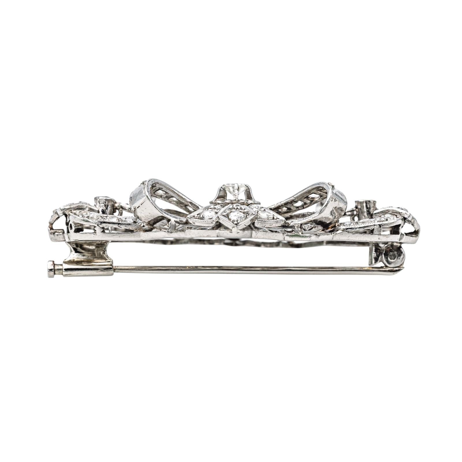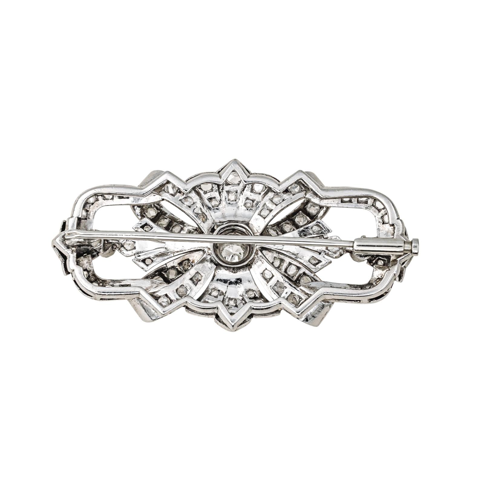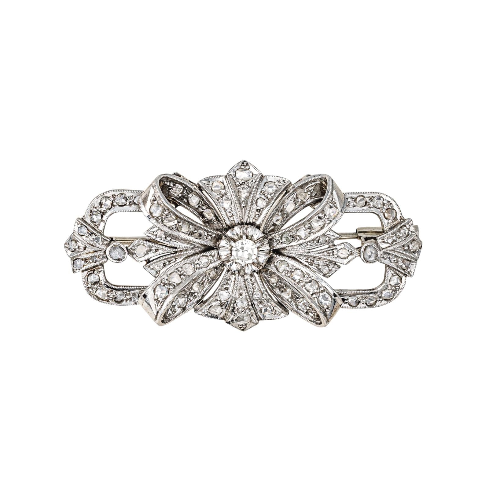 Broche en palladium, à motif noeud sertie de diamants, 1 diamant taille huit/huit, environ I-SI, d'un poids total d'environ 0,125 ct, entouré de 8 diamants taille rose, d'un poids total d'environ 1,15 cts, (chaque diamant d'un poids d'environ 0,03 ct), 45 diamants taille rose, d'un poids total d'environ 0,90 ct, (chaque diamant d'un poids total d'environ 0,020 ct), poids total diamants : 1,275 cts, dimensions : 4,50 cm x 2,50 cm, poids total : 8,65 g, excellent état