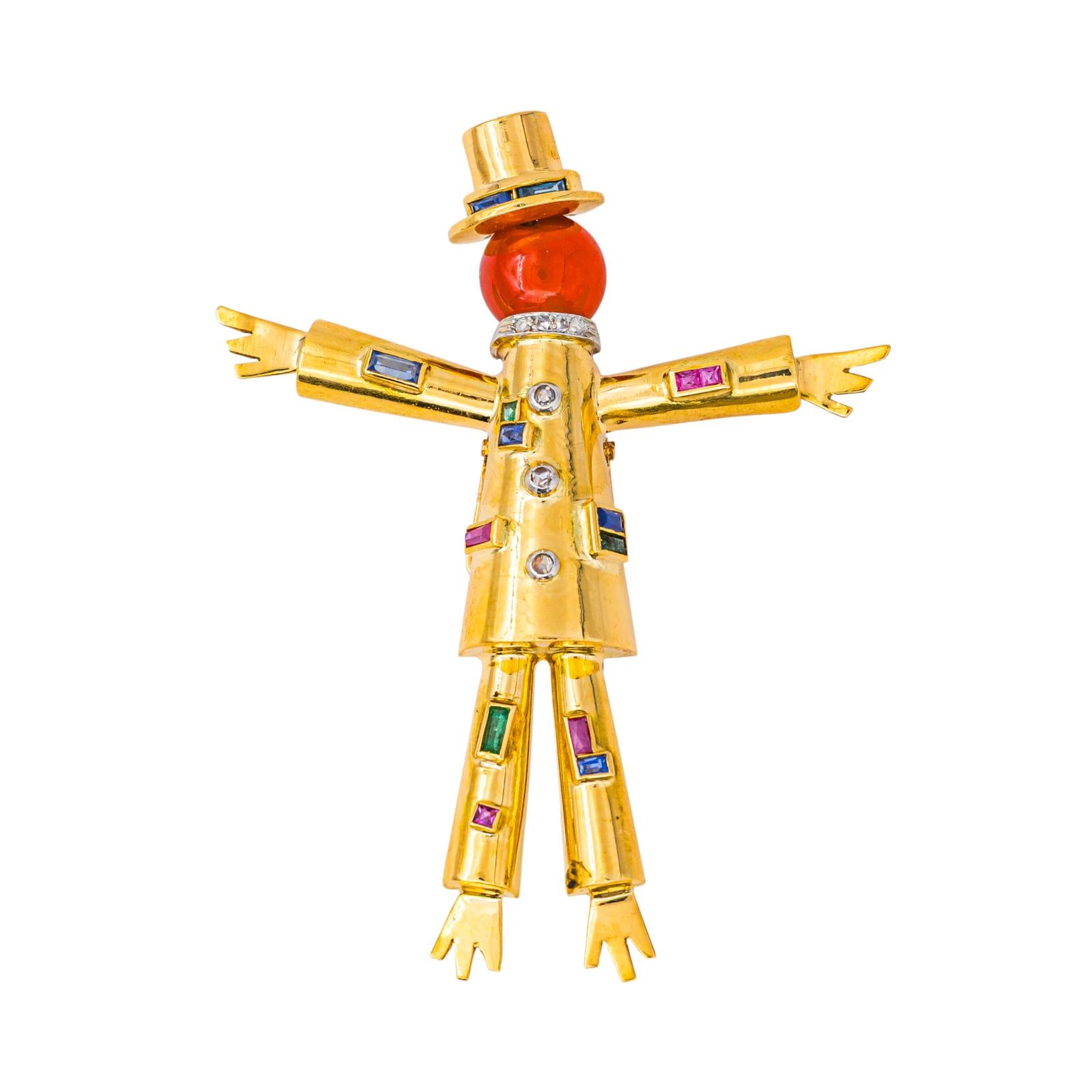Lacloche Broche Epouvantail Or jaune, Platine Cornaline, Saphirs, Diamant