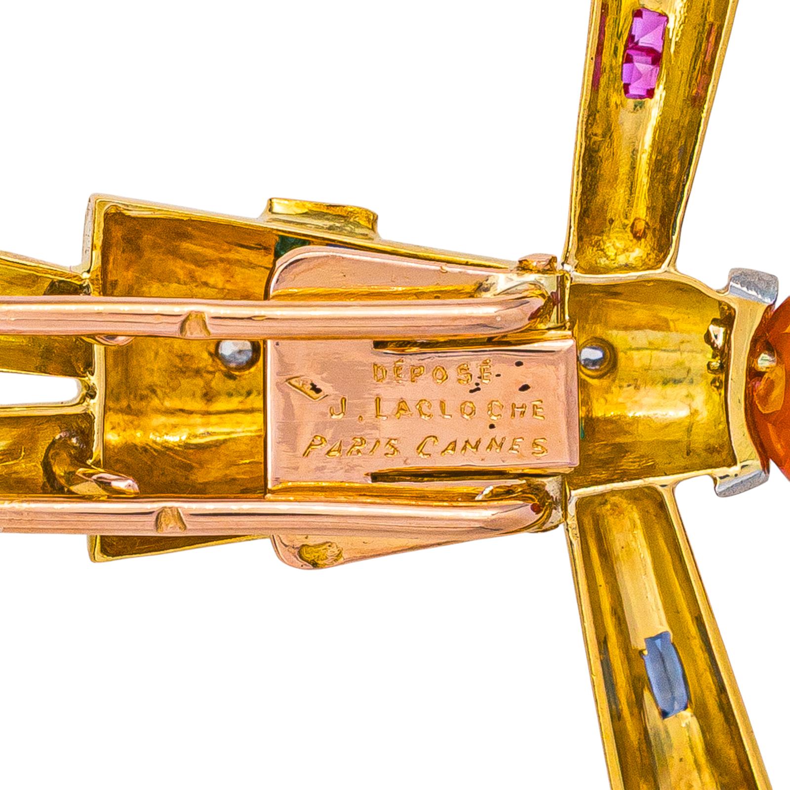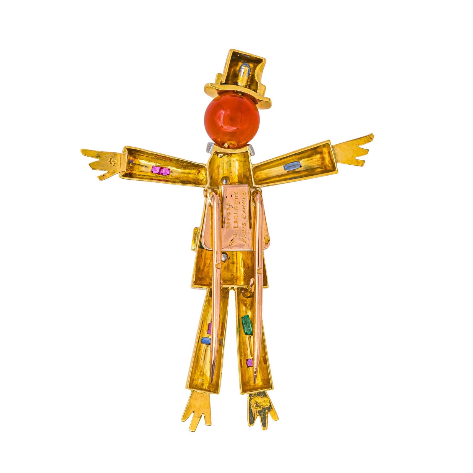 Broche signée de la Maison Lacloche en or jaune 750 millièmes (18 carats) et platine, modèle épouvantail, sertie d'une cornaline, de saphirs, de rubis, d'émeraude et de diamants, 1 cornaline taille bille, d'un poids total d'environ 2,43 cts, 3 émeraudes taille calibré d'un poids total d'environ 0,03ct, 5 rubis et 6 saphirs taille calibré d'un poids total d'environ 0,19 ct, 7 diamants taille rose, environ H-SI, d'un poids total d'environ 0,07 cts, (chaque diamant d'un poids d'environ 0,01 cts), dimensions: 4,77 cm x 3,69 cm, poids total : 6,32 g, poinçon tête d'aigle, excellent état