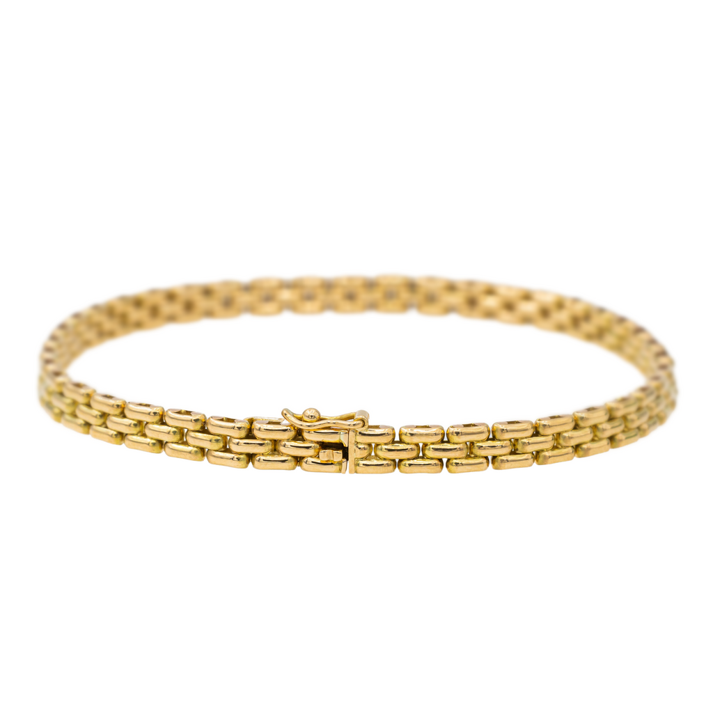 Bracelet Cartier or jaune 750 millièmes (18 carats), maille panthère, 3 rangs, n° de série : 288952, longueur: 17 cm, largeur: 0,39 cm, épaisseur: 0,2 cm, poids total: 12,67 g, fermoir avec huit de sécurité, poinçon tête d’aigle, excellent état