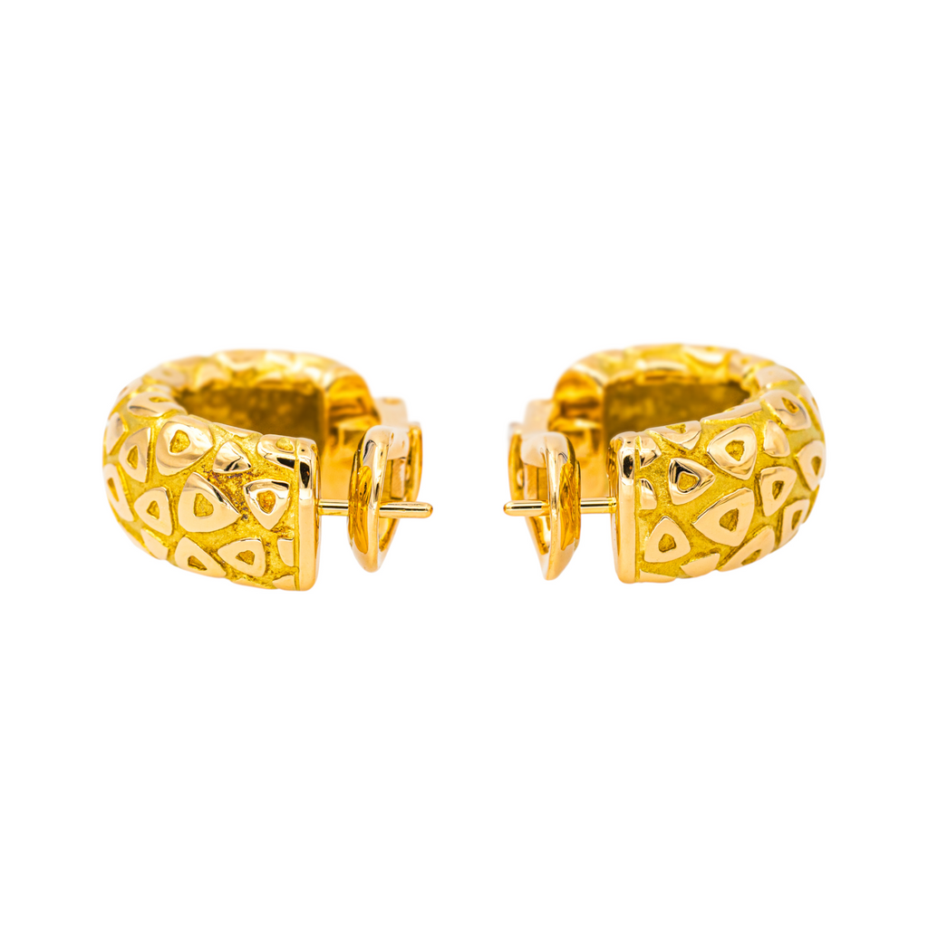 Créoles signées de la Maison Chaumet en or jaune 750 millièmes (18 carats), diamètre : 2,23 cm, largeur : 0,90 cm, poids total : 22,98 g, poinçon tête d'aigle, numérotées : 164801, vendu avec le pochon d'origine et d'époque, excellent état