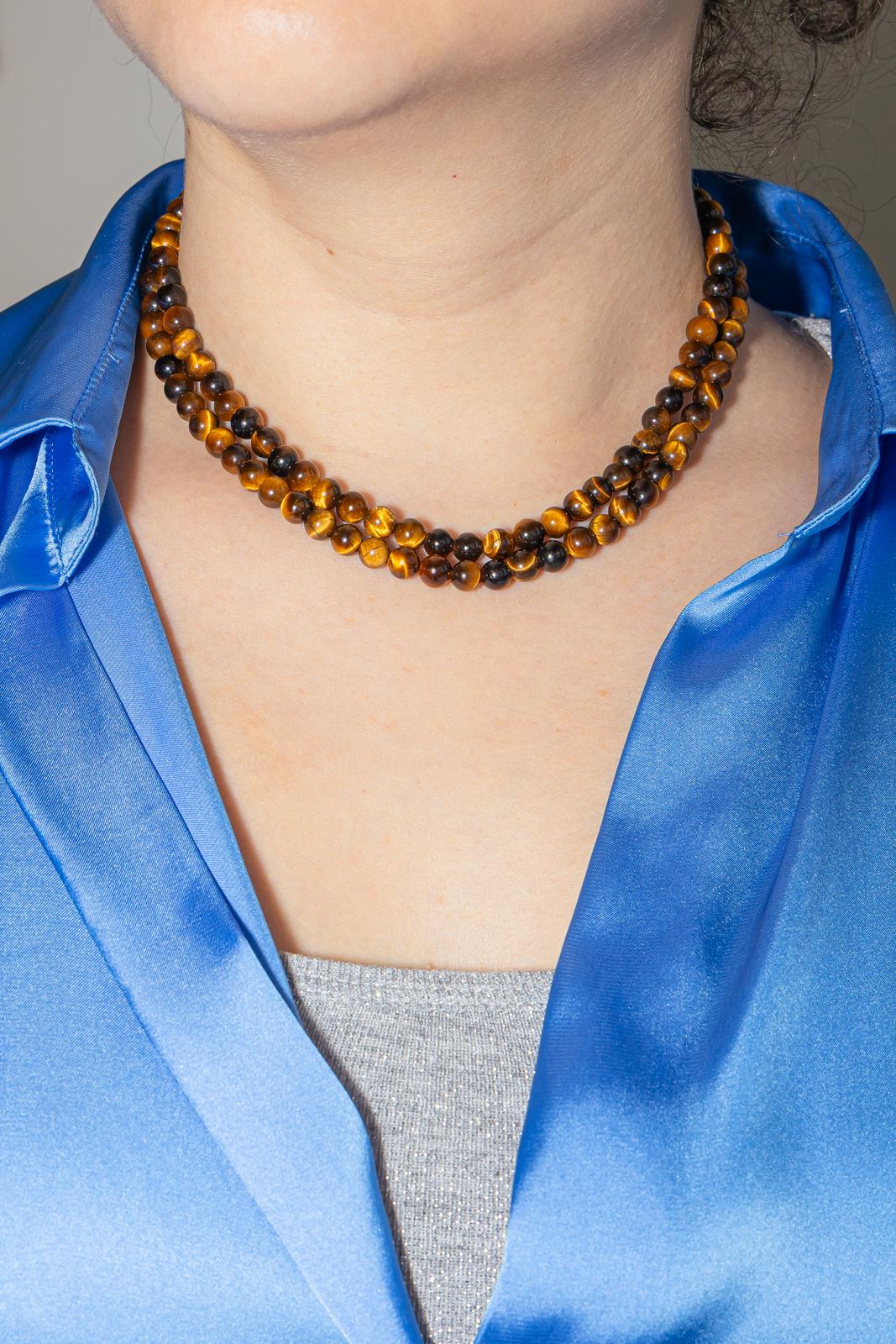 Collier de billes d'œil-de-tigre en or jaune et blanc 750 millièmes (18 carats), composé de 2 rangs d'une succession de 63 et 61 de billes d'œil-de-tigre, fermoir cliquet en or jaune et blanc sertie de 27 diamants taille brillant, environ G-SI, poids total des diamants environ 0,27ct (chaque diamant d'un poids d'environ 0,01ct) longueur: 38,5 cm, largeur: 1,63 cm, poids total: 52,58 g, poinçon hibou, excellent état.
