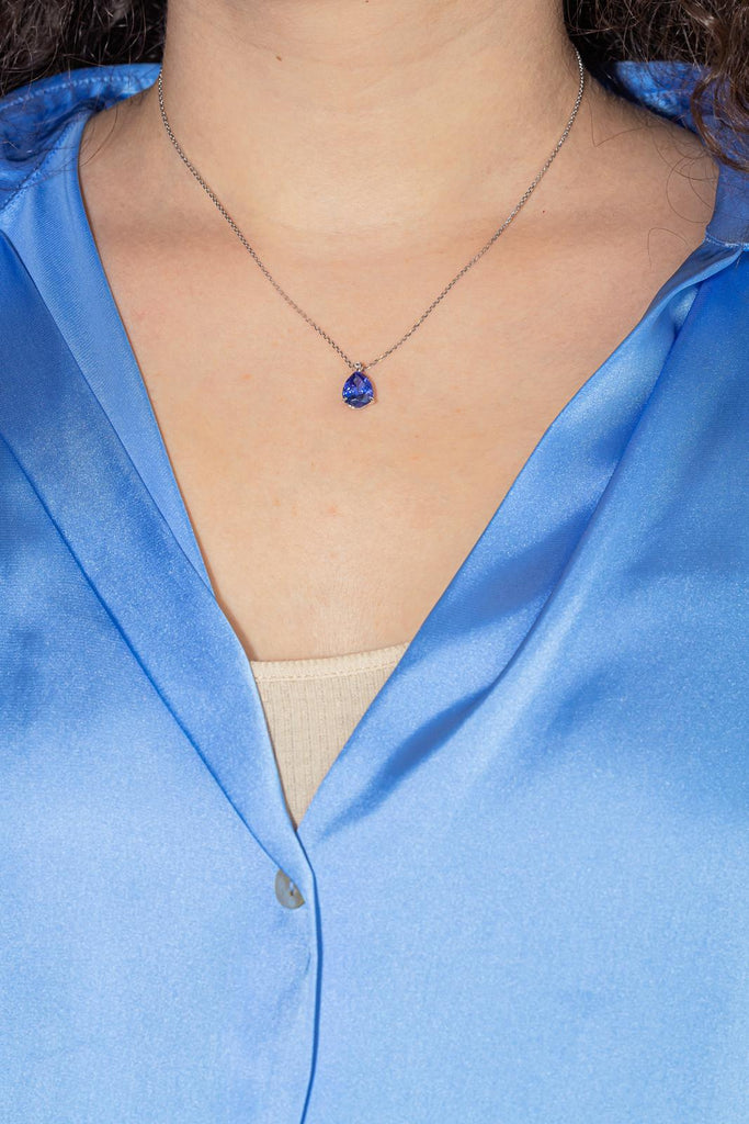Collier en or blanc 750 millièmes (18 carats), serti d'une tanzanite, taille poire, poids total : environ 2,46 cts, maille forçat, longueur : 40,00 cm, largeur de la chaîne : 0,07 cm, longueur du motif : 1,32 cm, largeur : 0,83 cm, poids total : 3,56 g, poinçon hibou, excellent état