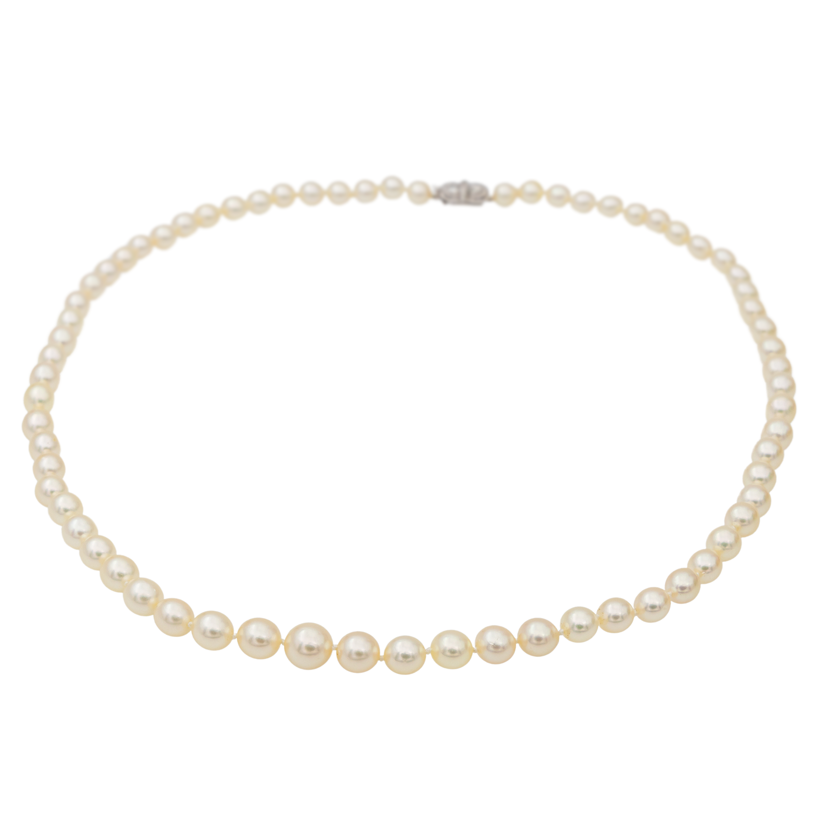 Collier de perles de culture blanches avec un fermoir rétro en or blanc 750 millièmes (18 carats), 68 perles blanches en chute, diamètre de la perle centrale : 8,75 mm, diamètre des perles au fermoir : 6,00 mm, 2 diamants de taille brillant estimés G/VS, environ 0,02 ct chacun, Poids total des diamants: 0,04 ct, longueur: 52 cm, largeur: 0,88 cm, Poids total: 31,72 g, Poinçon tête d'aigle, Excellent état